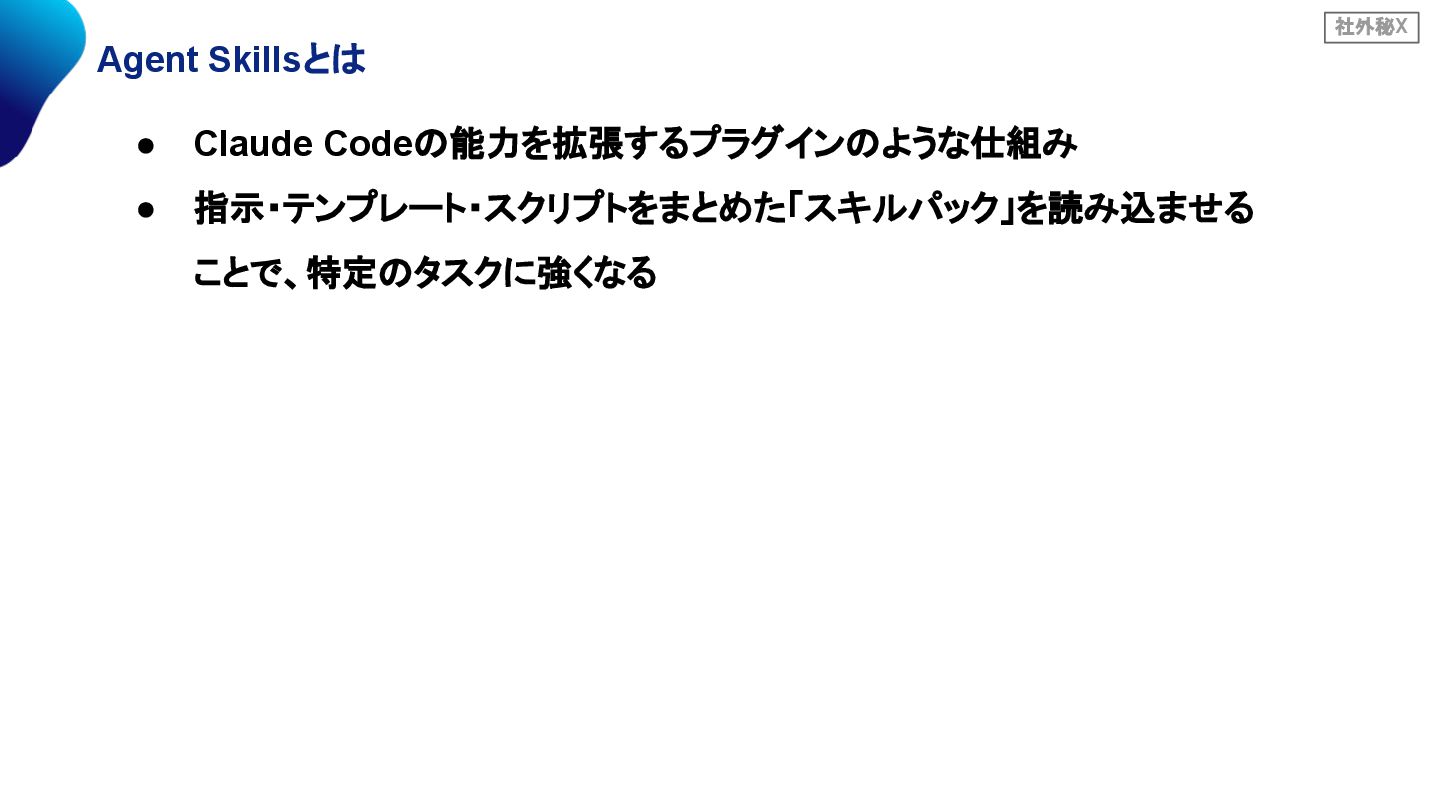 社外秘X Agent Skillsとは • Claude Codeの能力を拡張するプラグインのような仕組み • 指示・テンプレート・スクリプトをまとめた「スキルパック」を読み込ませる ことで、特定のタスクに強くなる