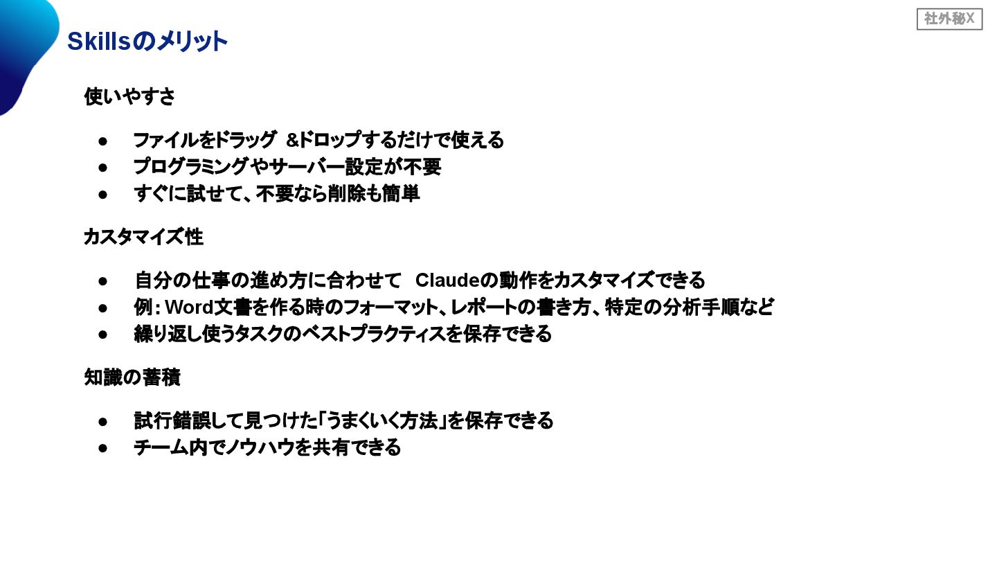 カスタマイズ性 • 自分の仕事の進め方に合わせて Claudeの動作をカスタマイズできる • 例:Word文書を作る時のフォーマット、レポートの書き方、特定の分析手順など • 繰り返し使うタスクのベストプラクティスを保存できる 知識の蓄積 • 試行錯誤して見つけた「うまくいく方法」を保存できる • チーム内でノウハウを共有できる