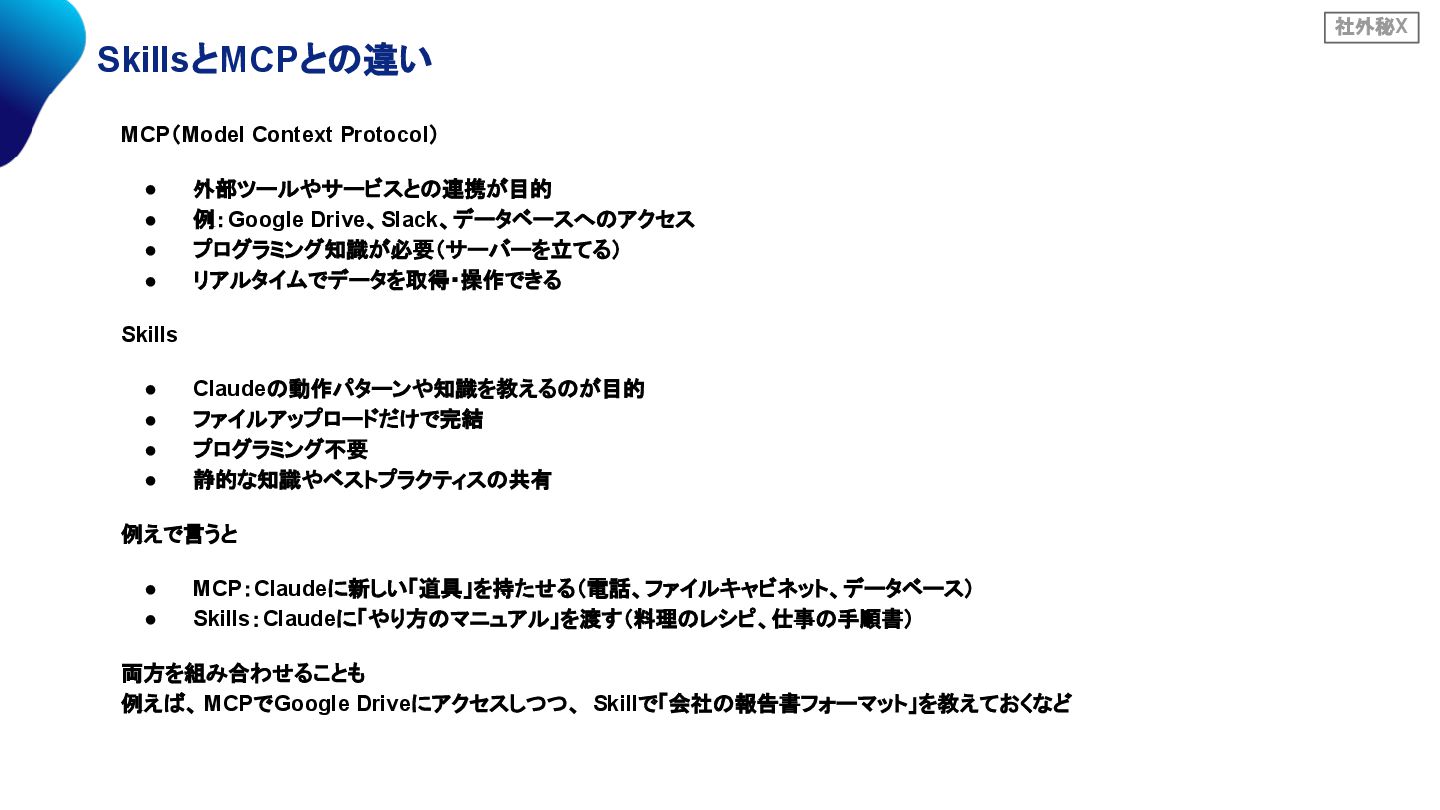 • プログラミング知識が必要(サーバーを立てる) • リアルタイムでデータを取得・操作できる Skills • Claudeの動作パターンや知識を教えるのが目的 • ファイルアップロードだけで完結 • プログラミング不要 • 静的な知識やベストプラクティスの共有 例えで言うと • MCP:Claudeに新しい「道具」を持たせる(電話、ファイルキャビネット、データベース) • Skills:Claudeに「やり方のマニュアル」を渡す(料理のレシピ、仕事の手順書) 両方を組み合わせることも 例えば、 MCPでGoogle Driveにアクセスしつつ、 Skillで「会社の報告書フォーマット」を教えておくなど