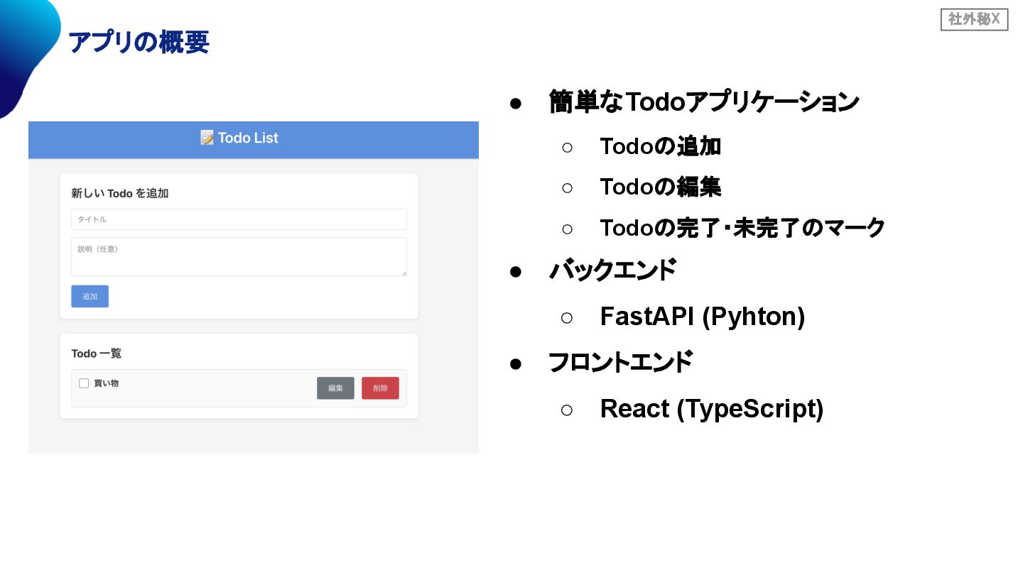 社外秘X • 簡単なTodoアプリケーション ◦ Todoの追加 ◦ Todoの編集 ◦ Todoの完了・未完了のマーク •