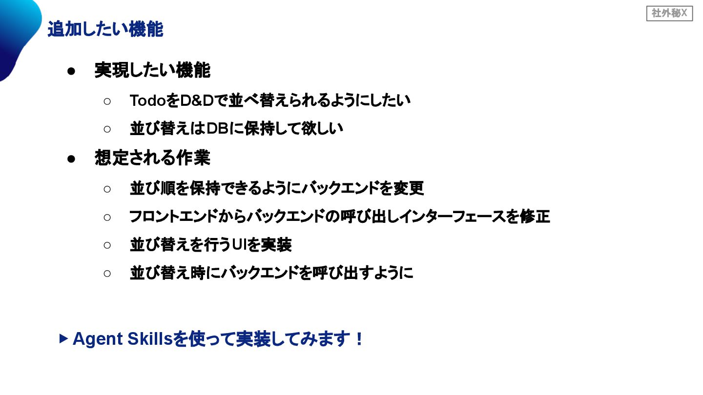 ◦ 並び順を保持できるようにバックエンドを変更 ◦ フロントエンドからバックエンドの呼び出しインターフェースを修正 ◦ 並び替えを行うUIを実装 ◦ 並び替え時にバックエンドを呼び出すように ▶ Agent Skillsを使って実装してみます!