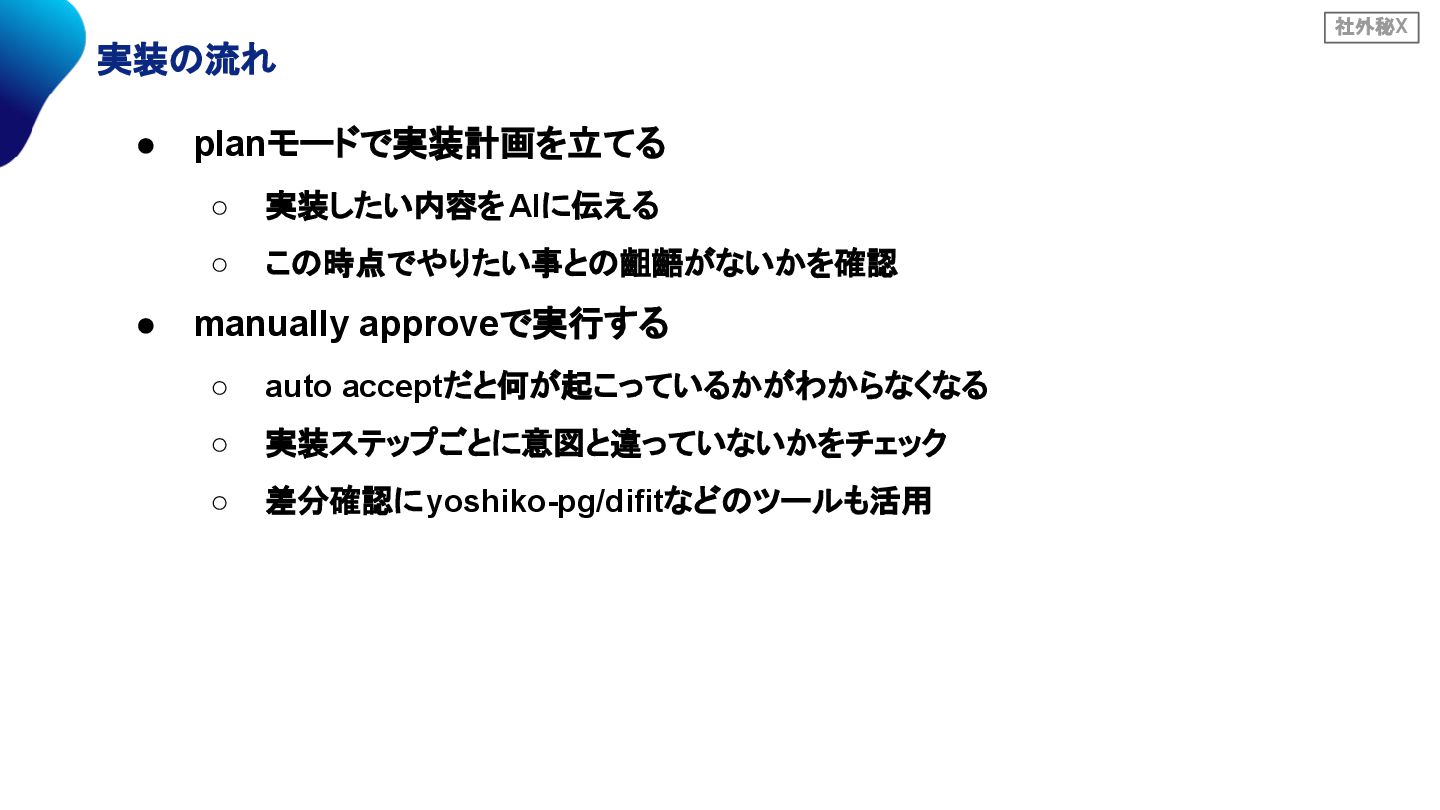 approveで実行する ◦ auto acceptだと何が起こっているかがわからなくなる ◦ 実装ステップごとに意図と違っていないかをチェック ◦ 差分確認にyoshiko-pg/difitなどのツールも活用