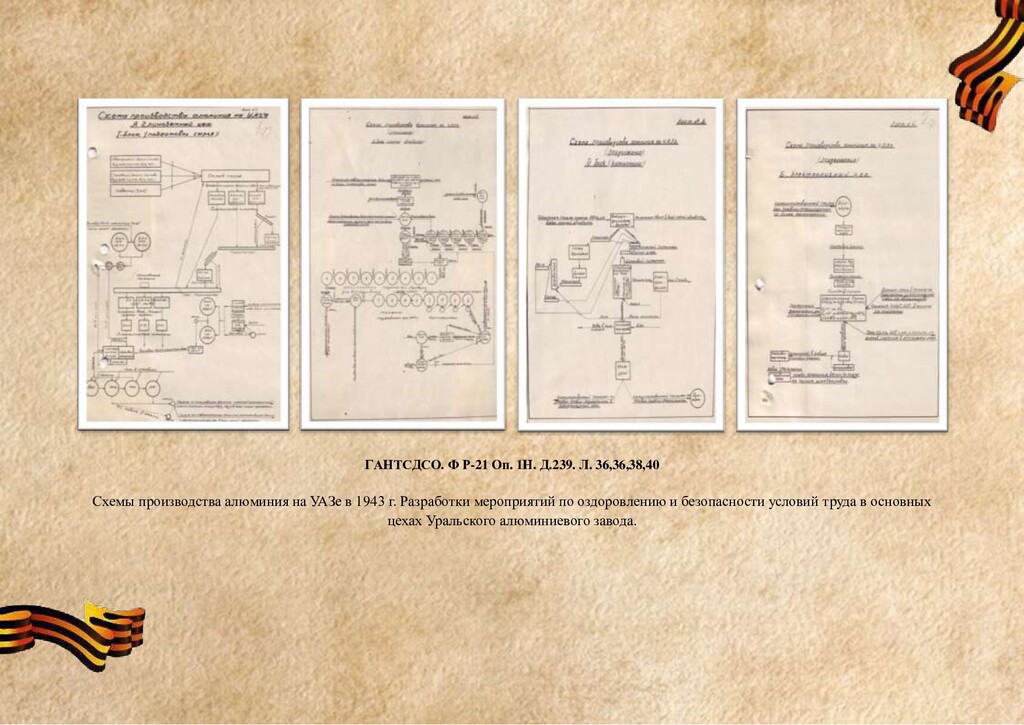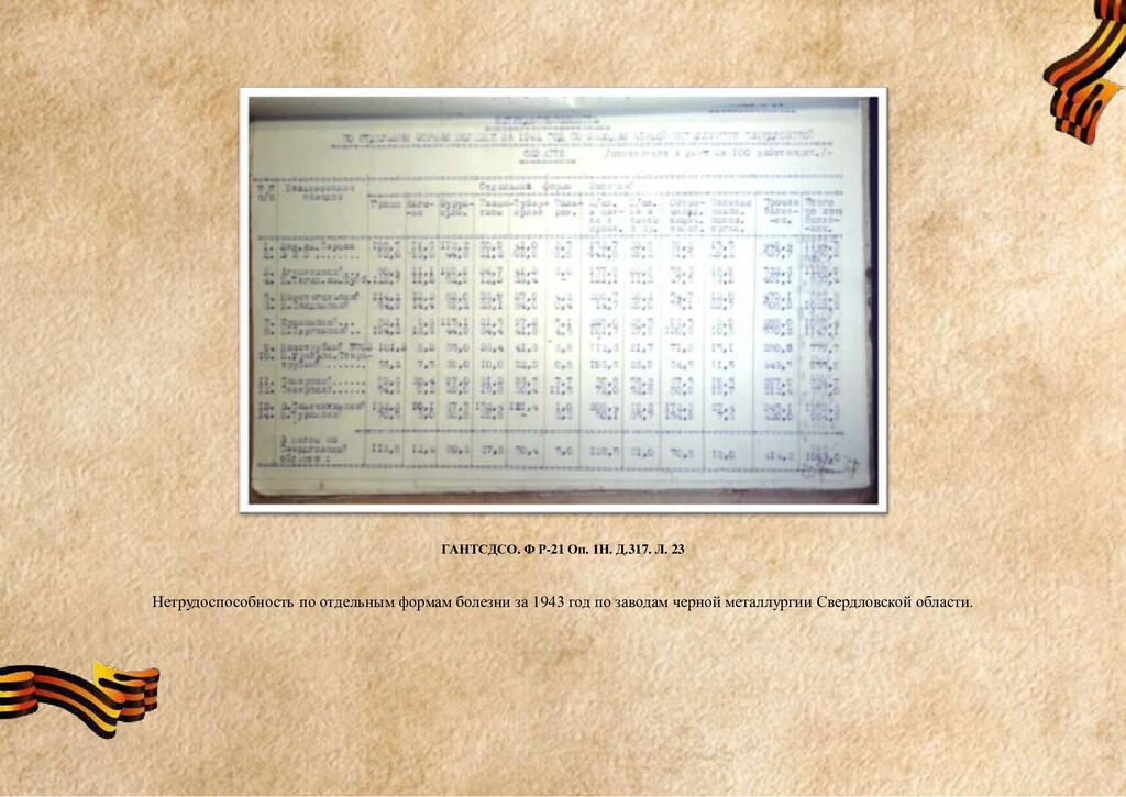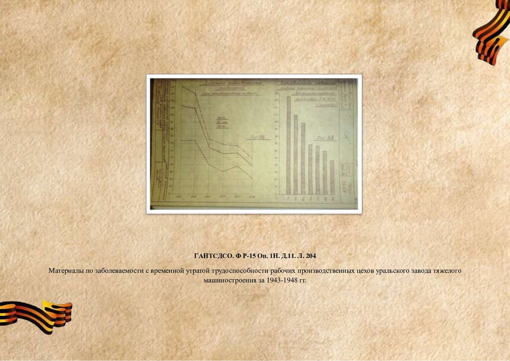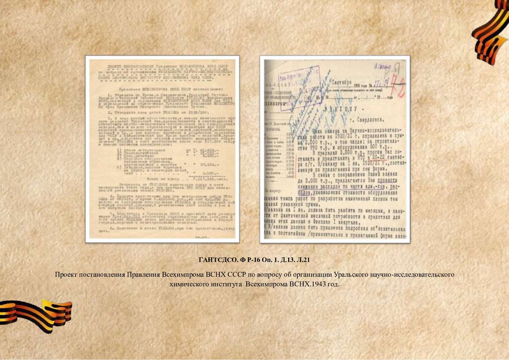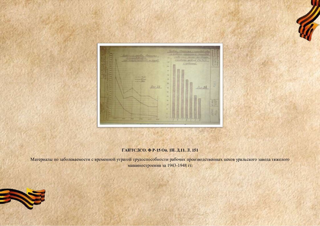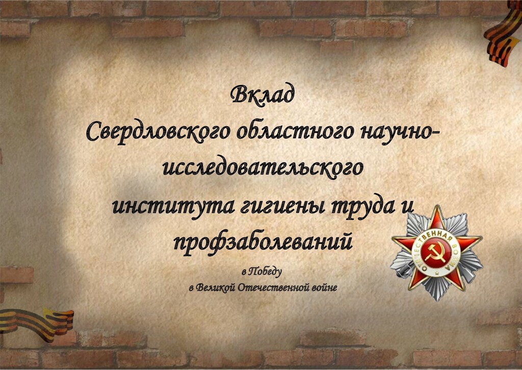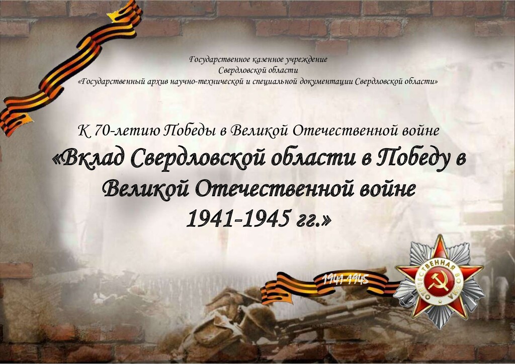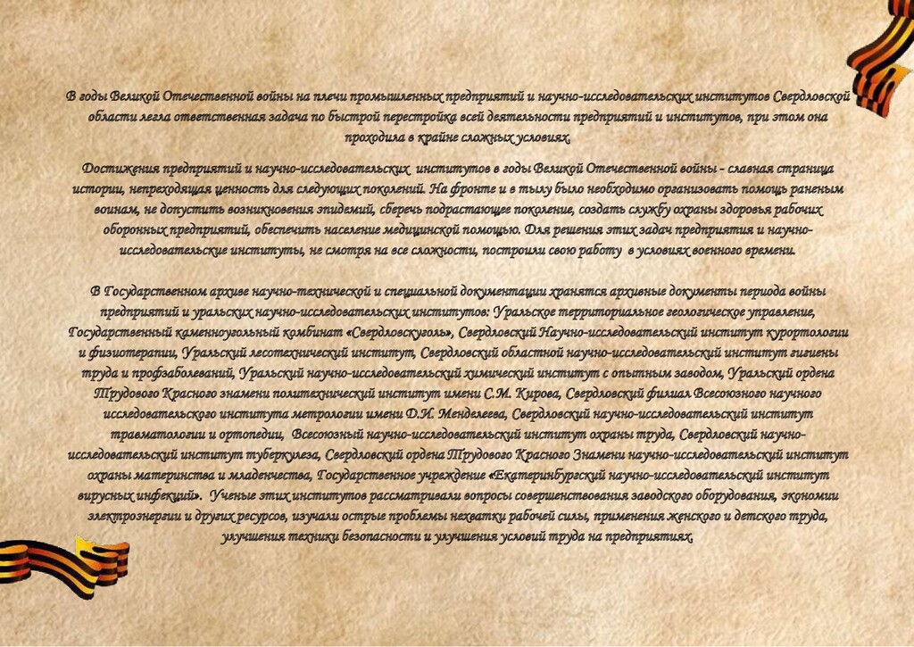 научно-исследовательских институтов Свердловской области легла ответственная задача по быстрой перестройка всей деятельности предприятий и институтов, при этом она проходила в крайне сложных условиях. Достижения предприятий и научно-исследовательских институтов в годы Великой Отечественной войны - славная страница истории, непреходящая ценность для следующих поколений. На фронте и в тылу было необходимо организовать помощь раненым воинам, не допустить возникновения эпидемий, сберечь подрастающее поколение, создать службу охраны здоровья рабочих оборонных предприятий, обеспечить население медицинской помощью. Для решения этих задач предприятия и научно- исследовательские институты, не смотря на все сложности, построили свою работу в условиях военного времени. В Государственном архиве научно-технической и специальной документации хранятся архивные документы периода войны предприятий и уральских научно-исследовательских институтов: Уральское территориальное геологическое управление, Государственный каменноугольный комбинат «Свердловскуголь», Свердловский Научно-исследовательский институт курортологии и физиотерапии, Уральский лесотехнический институт, Свердловский областной научно-исследовательский институт гигиены труда и профзаболеваний, Уральский научно-исследовательский химический институт с опытным заводом, Уральский ордена Трудового Красного знамени политехнический институт имени С.М. Кирова, Свердловский филиал Всесоюзного научного исследовательского института метрологии имени Д.И. Менделеева, Свердловский научно-исследовательский институт травматологии и ортопедии, Всесоюзный научно-исследовательский институт охраны труда, Свердловский научно- исследовательский институт туберкулеза, Свердловский ордена Трудового Красного Знамени научно-исследовательский институт охраны материнства и младенчества, Государственное учреждение «Екатеринбургский научно-исследовательский институт вирусных инфекций». Ученые этих институтов рассматривали вопросы совершенствования заводского оборудования, экономии электроэнергии и других ресурсов, изучали острые проблемы нехватки рабочей силы, применения женского и детского труда, улучшения техники безопасности и улучшения условий труда на предприятиях.
