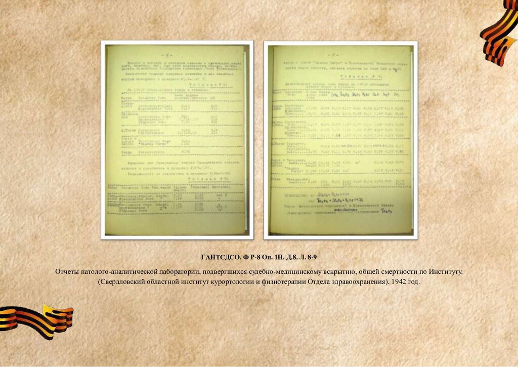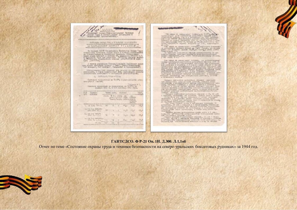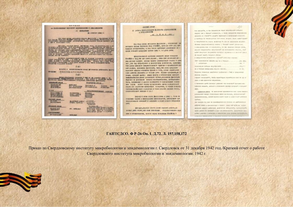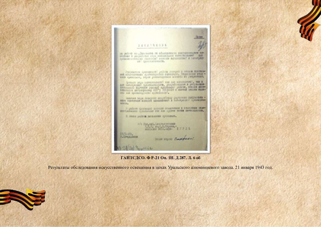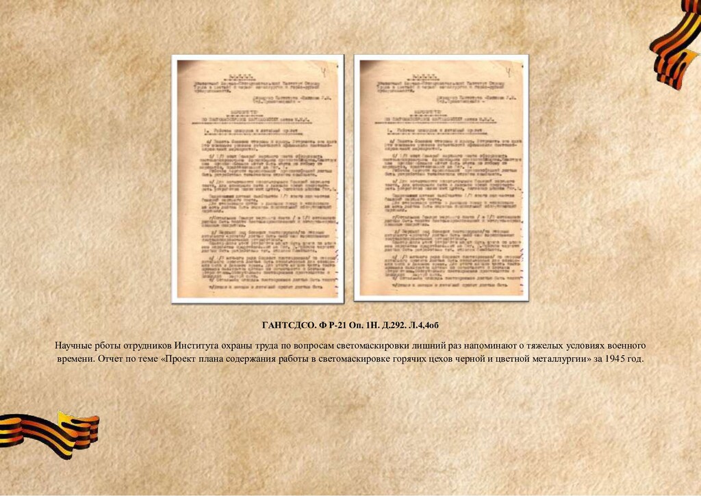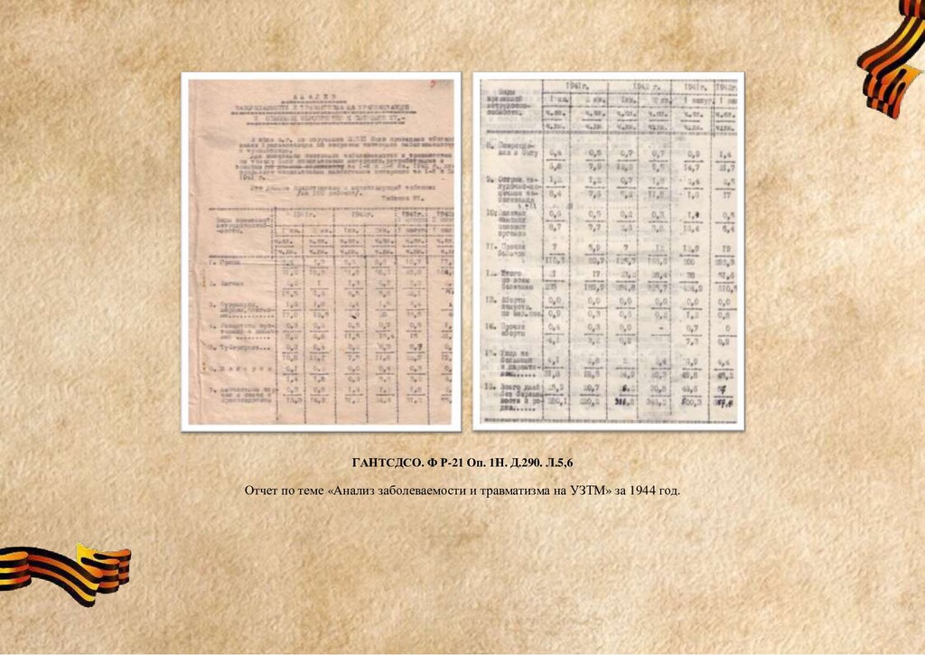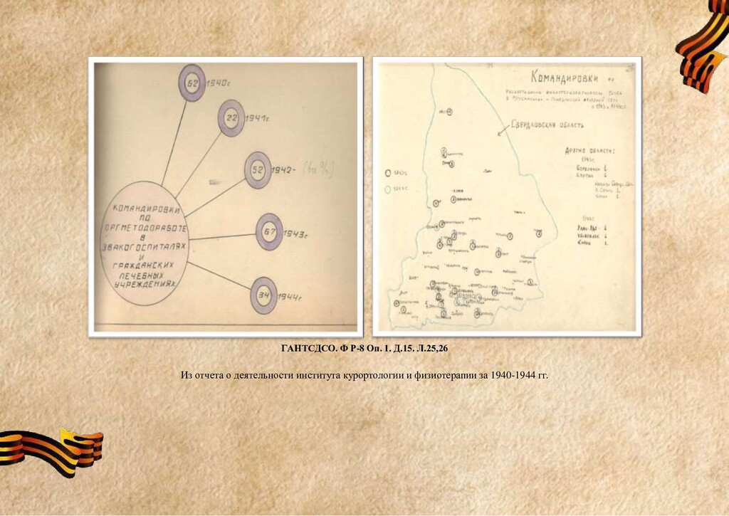 научно-исследовательских институтов Свердловской области легла ответственная задача по быстрой перестройка всей деятельности предприятий и институтов, при этом она проходила в крайне сложных условиях. Достижения предприятий и научно-исследовательских институтов в годы Великой Отечественной войны - славная страница истории, непреходящая ценность для следующих поколений. На фронте и в тылу было необходимо организовать помощь раненым воинам, не допустить возникновения эпидемий, сберечь подрастающее поколение, создать службу охраны здоровья рабочих оборонных предприятий, обеспечить население медицинской помощью. Для решения этих задач предприятия и научно- исследовательские институты, не смотря на все сложности, построили свою работу в условиях военного времени. В Государственном архиве научно-технической и специальной документации хранятся архивные документы периода войны предприятий и уральских научно-исследовательских институтов: Уральское территориальное геологическое управление, Государственный каменноугольный комбинат «Свердловскуголь», Свердловский Научно-исследовательский институт курортологии и физиотерапии, Уральский лесотехнический институт, Свердловский областной научно-исследовательский институт гигиены труда и профзаболеваний, Уральский научно-исследовательский химический институт с опытным заводом, Уральский ордена Трудового Красного знамени политехнический институт имени С.М. Кирова, Свердловский филиал Всесоюзного научного исследовательского института метрологии имени Д.И. Менделеева, Свердловский научно-исследовательский институт травматологии и ортопедии, Всесоюзный научно-исследовательский институт охраны труда, Свердловский научно- исследовательский институт туберкулеза, Свердловский ордена Трудового Красного Знамени научно-исследовательский институт охраны материнства и младенчества, Государственное учреждение «Екатеринбургский научно-исследовательский институт вирусных инфекций». Ученые этих институтов рассматривали вопросы совершенствования заводского оборудования, экономии электроэнергии и других ресурсов, изучали острые проблемы нехватки рабочей силы, применения женского и детского труда, улучшения техники безопасности и улучшения условий труда на предприятиях.