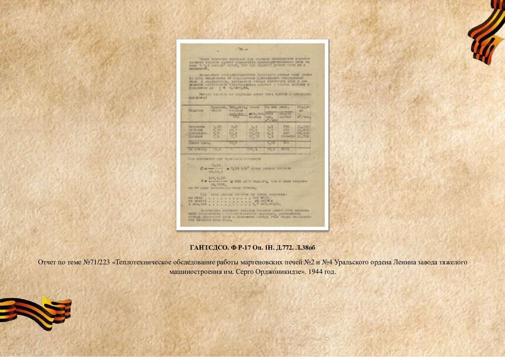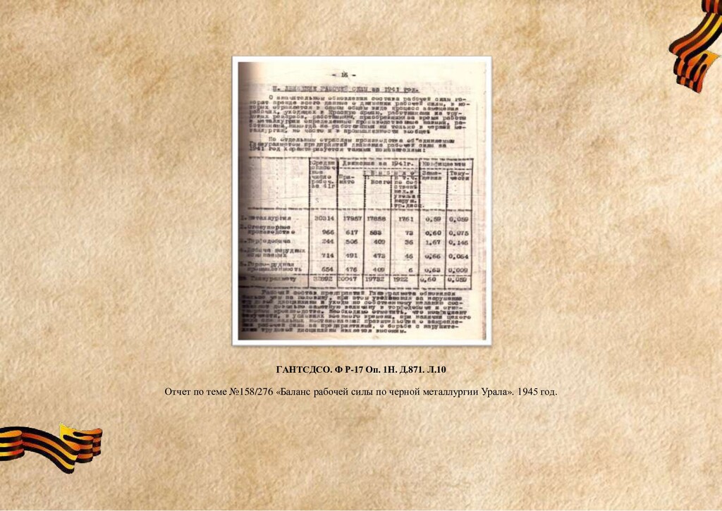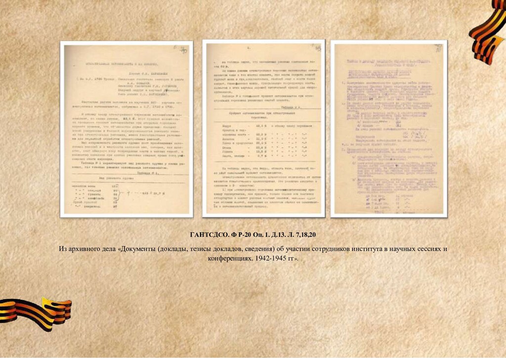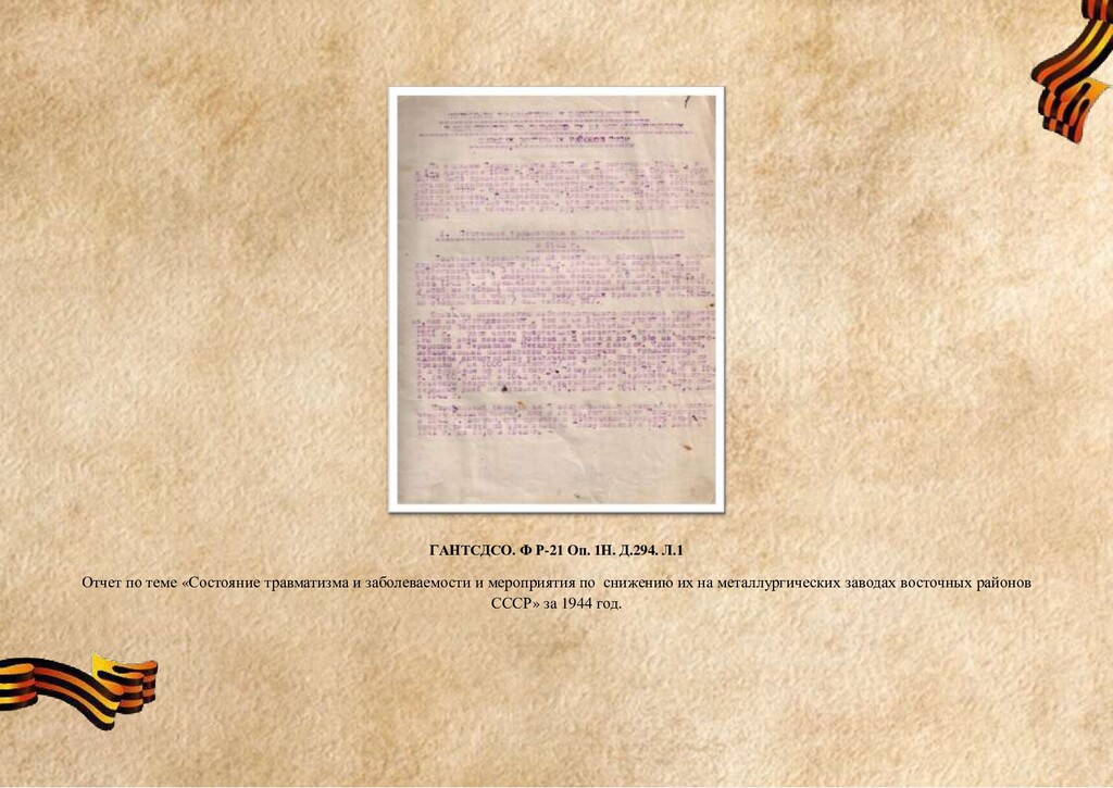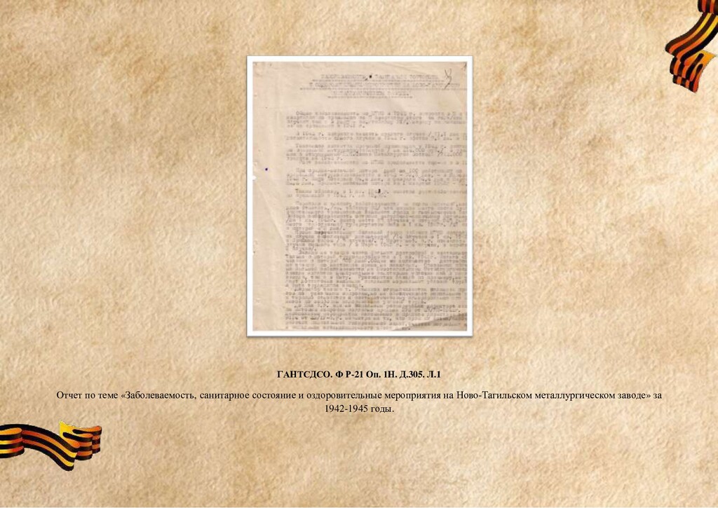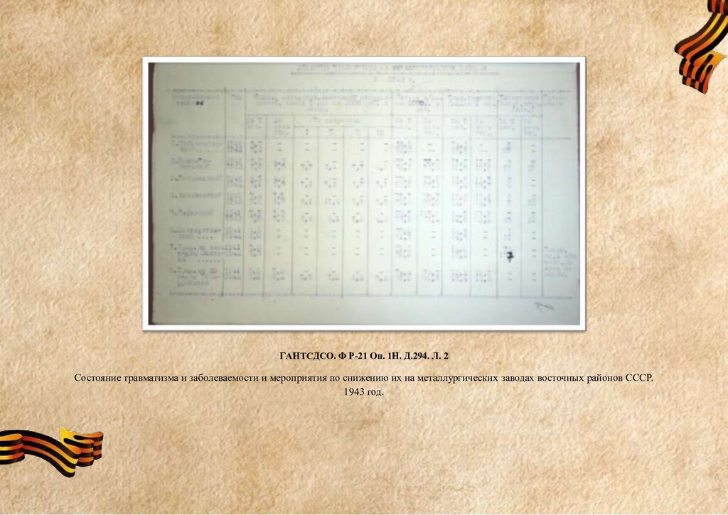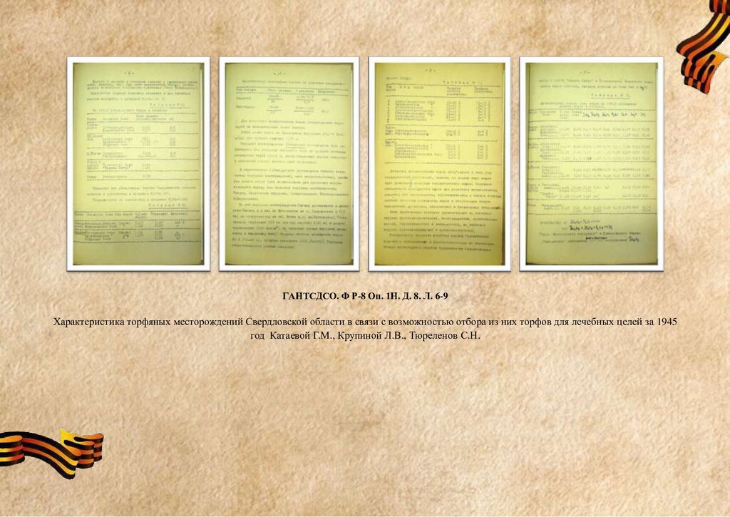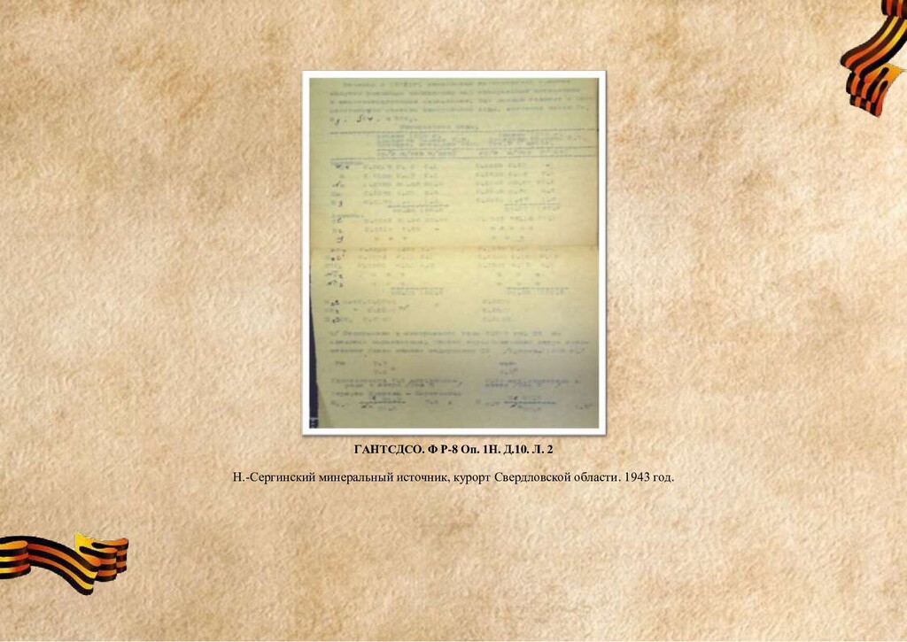 научно-исследовательских институтов Свердловской области легла ответственная задача по быстрой перестройка всей деятельности предприятий и институтов, при этом она проходила в крайне сложных условиях. Достижения предприятий и научно-исследовательских институтов в годы Великой Отечественной войны - славная страница истории, непреходящая ценность для следующих поколений. На фронте и в тылу было необходимо организовать помощь раненым воинам, не допустить возникновения эпидемий, сберечь подрастающее поколение, создать службу охраны здоровья рабочих оборонных предприятий, обеспечить население медицинской помощью. Для решения этих задач предприятия и научно- исследовательские институты, не смотря на все сложности, построили свою работу в условиях военного времени. В Государственном архиве научно-технической и специальной документации хранятся архивные документы периода войны предприятий и уральских научно-исследовательских институтов: Уральское территориальное геологическое управление, Государственный каменноугольный комбинат «Свердловскуголь», Свердловский Научно-исследовательский институт курортологии и физиотерапии, Уральский лесотехнический институт, Свердловский областной научно-исследовательский институт гигиены труда и профзаболеваний, Уральский научно-исследовательский химический институт с опытным заводом, Уральский ордена Трудового Красного знамени политехнический институт имени С.М. Кирова, Свердловский филиал Всесоюзного научного исследовательского института метрологии имени Д.И. Менделеева, Свердловский научно-исследовательский институт травматологии и ортопедии, Всесоюзный научно-исследовательский институт охраны труда, Свердловский научно- исследовательский институт туберкулеза, Свердловский ордена Трудового Красного Знамени научно-исследовательский институт охраны материнства и младенчества, Государственное учреждение «Екатеринбургский научно-исследовательский институт вирусных инфекций». Ученые этих институтов рассматривали вопросы совершенствования заводского оборудования, экономии электроэнергии и других ресурсов, изучали острые проблемы нехватки рабочей силы, применения женского и детского труда, улучшения техники безопасности и улучшения условий труда на предприятиях.
