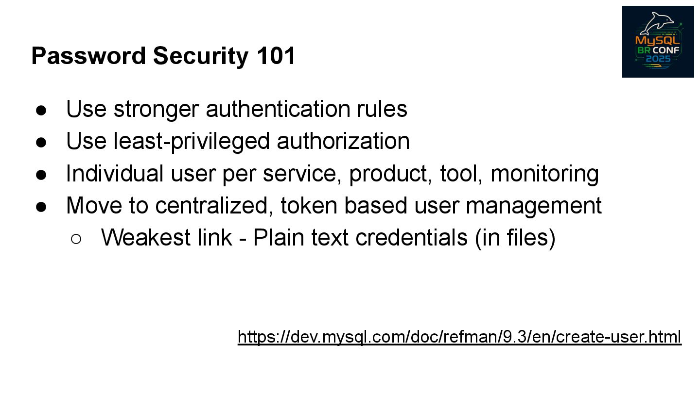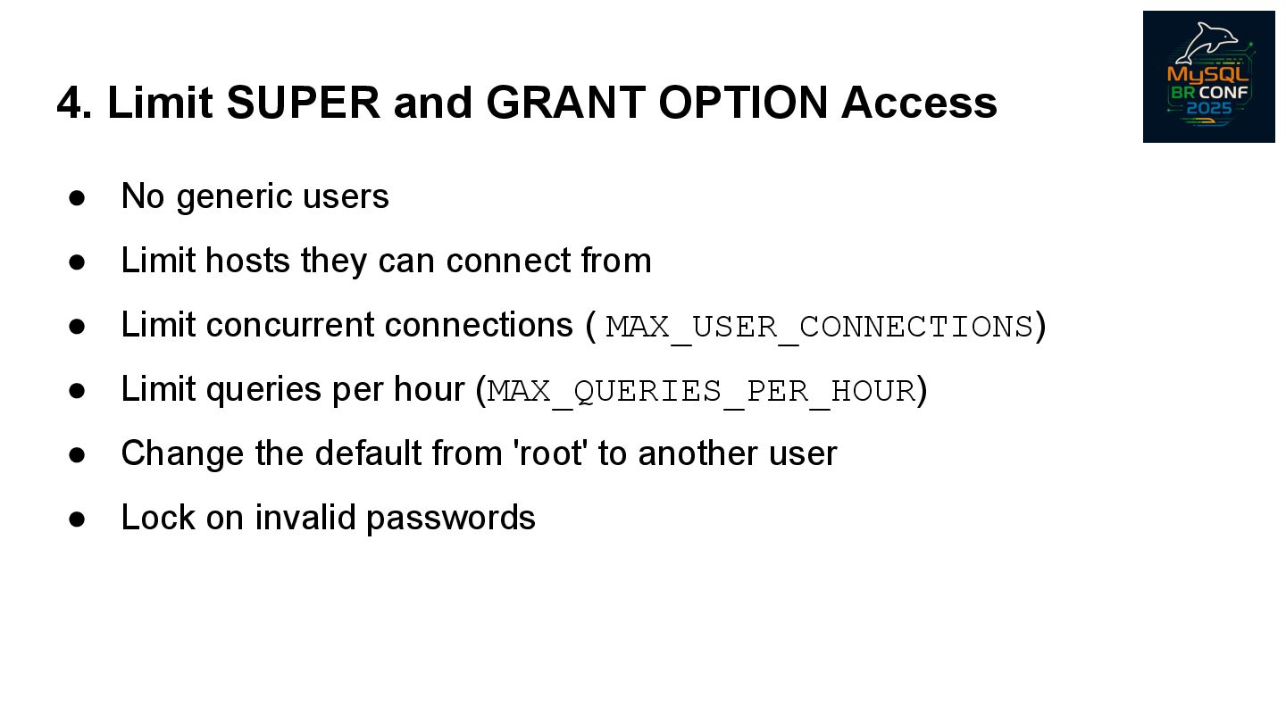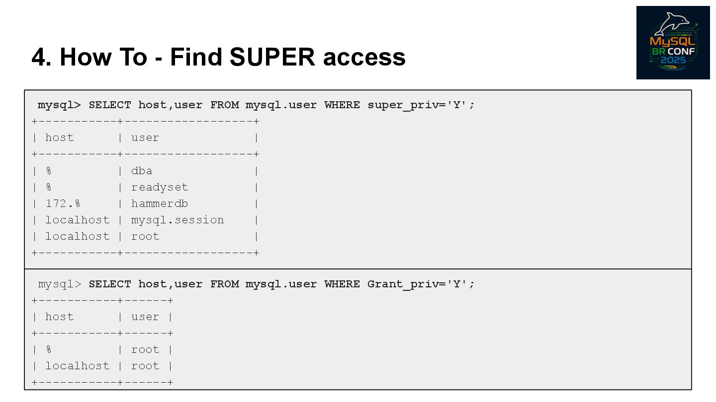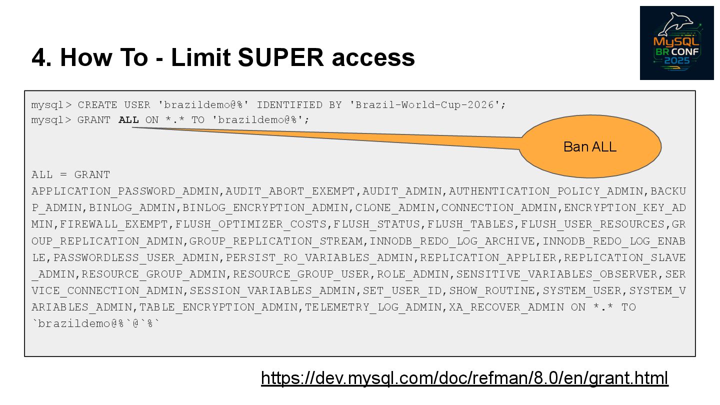 'brazildemo@%' IDENTIFIED BY 'Brazil-World-Cup-2026'; mysql> GRANT ALL ON *.* TO 'brazildemo@%'; ALL = GRANT APPLICATION_PASSWORD_ADMIN,AUDIT_ABORT_EXEMPT,AUDIT_ADMIN,AUTHENTICATION_POLICY_ADMIN,BACKU P_ADMIN,BINLOG_ADMIN,BINLOG_ENCRYPTION_ADMIN,CLONE_ADMIN,CONNECTION_ADMIN,ENCRYPTION_KEY_AD MIN,FIREWALL_EXEMPT,FLUSH_OPTIMIZER_COSTS,FLUSH_STATUS,FLUSH_TABLES,FLUSH_USER_RESOURCES,GR OUP_REPLICATION_ADMIN,GROUP_REPLICATION_STREAM,INNODB_REDO_LOG_ARCHIVE,INNODB_REDO_LOG_ENAB LE,PASSWORDLESS_USER_ADMIN,PERSIST_RO_VARIABLES_ADMIN,REPLICATION_APPLIER,REPLICATION_SLAVE _ADMIN,RESOURCE_GROUP_ADMIN,RESOURCE_GROUP_USER,ROLE_ADMIN,SENSITIVE_VARIABLES_OBSERVER,SER VICE_CONNECTION_ADMIN,SESSION_VARIABLES_ADMIN,SET_USER_ID,SHOW_ROUTINE,SYSTEM_USER,SYSTEM_V ARIABLES_ADMIN,TABLE_ENCRYPTION_ADMIN,TELEMETRY_LOG_ADMIN,XA_RECOVER_ADMIN ON *.* TO `brazildemo@%`@`%` Ban ALL https://dev.mysql.com/doc/refman/8.0/en/grant.html