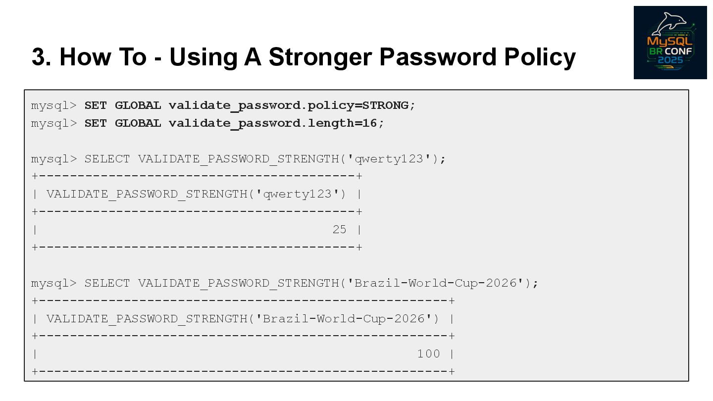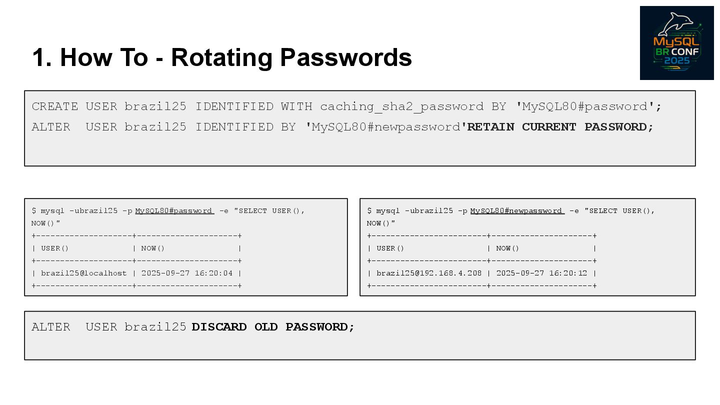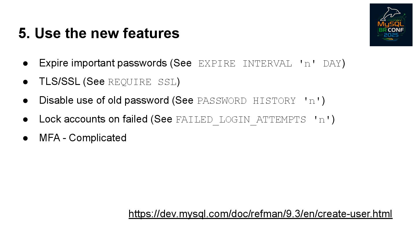 'brazildemo@%' IDENTIFIED BY 'Brazil-World-Cup-2026'; mysql> GRANT ALL ON *.* TO 'brazildemo@%'; ALL = GRANT APPLICATION_PASSWORD_ADMIN,AUDIT_ABORT_EXEMPT,AUDIT_ADMIN,AUTHENTICATION_POLICY_ADMIN,BACKU P_ADMIN,BINLOG_ADMIN,BINLOG_ENCRYPTION_ADMIN,CLONE_ADMIN,CONNECTION_ADMIN,ENCRYPTION_KEY_AD MIN,FIREWALL_EXEMPT,FLUSH_OPTIMIZER_COSTS,FLUSH_STATUS,FLUSH_TABLES,FLUSH_USER_RESOURCES,GR OUP_REPLICATION_ADMIN,GROUP_REPLICATION_STREAM,INNODB_REDO_LOG_ARCHIVE,INNODB_REDO_LOG_ENAB LE,PASSWORDLESS_USER_ADMIN,PERSIST_RO_VARIABLES_ADMIN,REPLICATION_APPLIER,REPLICATION_SLAVE _ADMIN,RESOURCE_GROUP_ADMIN,RESOURCE_GROUP_USER,ROLE_ADMIN,SENSITIVE_VARIABLES_OBSERVER,SER VICE_CONNECTION_ADMIN,SESSION_VARIABLES_ADMIN,SET_USER_ID,SHOW_ROUTINE,SYSTEM_USER,SYSTEM_V ARIABLES_ADMIN,TABLE_ENCRYPTION_ADMIN,TELEMETRY_LOG_ADMIN,XA_RECOVER_ADMIN ON *.* TO `brazildemo@%`@`%` Ban ALL https://dev.mysql.com/doc/refman/8.0/en/grant.html