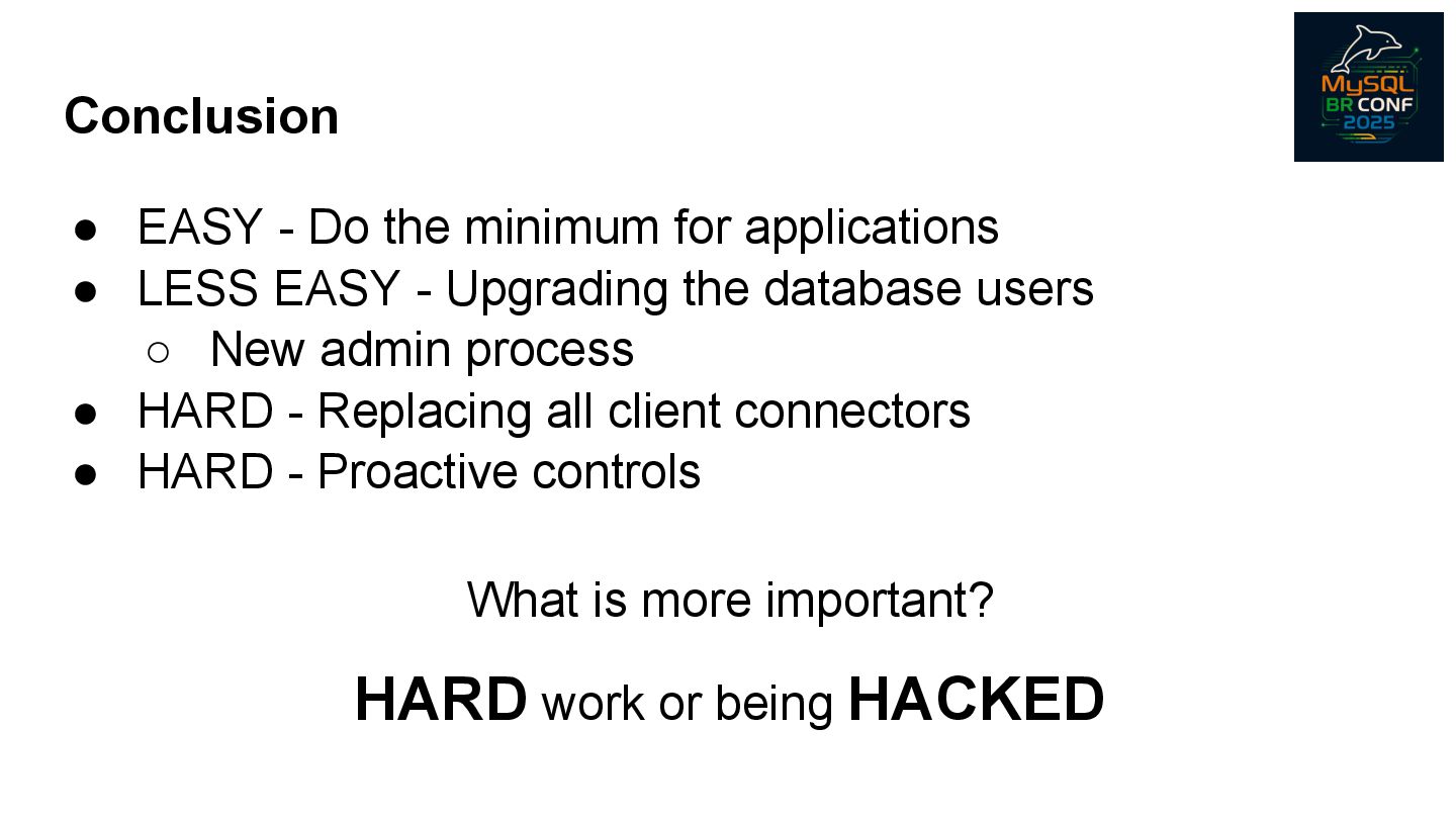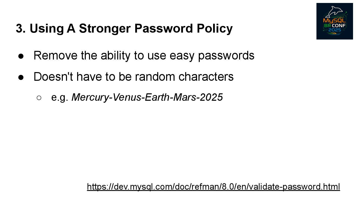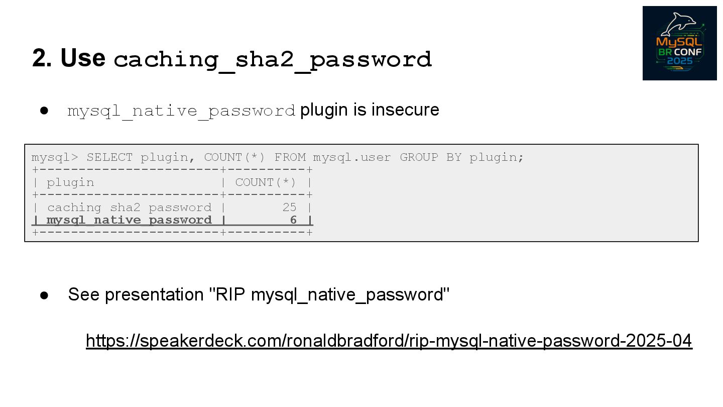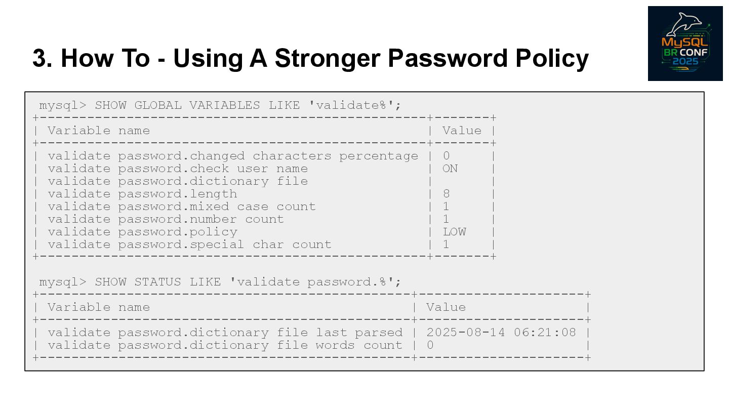 'brazildemo@%' IDENTIFIED BY 'Brazil-World-Cup-2026'; mysql> GRANT ALL ON *.* TO 'brazildemo@%'; ALL = GRANT APPLICATION_PASSWORD_ADMIN,AUDIT_ABORT_EXEMPT,AUDIT_ADMIN,AUTHENTICATION_POLICY_ADMIN,BACKU P_ADMIN,BINLOG_ADMIN,BINLOG_ENCRYPTION_ADMIN,CLONE_ADMIN,CONNECTION_ADMIN,ENCRYPTION_KEY_AD MIN,FIREWALL_EXEMPT,FLUSH_OPTIMIZER_COSTS,FLUSH_STATUS,FLUSH_TABLES,FLUSH_USER_RESOURCES,GR OUP_REPLICATION_ADMIN,GROUP_REPLICATION_STREAM,INNODB_REDO_LOG_ARCHIVE,INNODB_REDO_LOG_ENAB LE,PASSWORDLESS_USER_ADMIN,PERSIST_RO_VARIABLES_ADMIN,REPLICATION_APPLIER,REPLICATION_SLAVE _ADMIN,RESOURCE_GROUP_ADMIN,RESOURCE_GROUP_USER,ROLE_ADMIN,SENSITIVE_VARIABLES_OBSERVER,SER VICE_CONNECTION_ADMIN,SESSION_VARIABLES_ADMIN,SET_USER_ID,SHOW_ROUTINE,SYSTEM_USER,SYSTEM_V ARIABLES_ADMIN,TABLE_ENCRYPTION_ADMIN,TELEMETRY_LOG_ADMIN,XA_RECOVER_ADMIN ON *.* TO `brazildemo@%`@`%` Ban ALL https://dev.mysql.com/doc/refman/8.0/en/grant.html