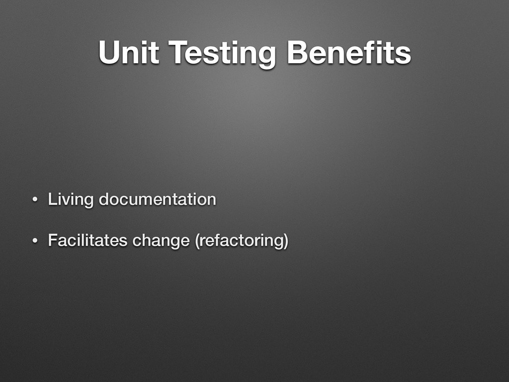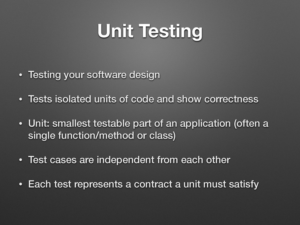 units of code and show correctness • Unit: smallest testable part of an application (often a single function/method or class) • Test cases are independent from each other • Each test represents a contract a unit must satisfy