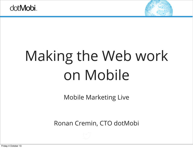 web, not a local one • Design for different devices, connectivity, use cases • Use Responsible Web Design • Mobile web isn’t a shrunken web • It can do more, but you have to design for it • Don’t limit yourself to desktop web thinking • Embrace the devices • Each has unique features— know them & avail of them! Friday 4 October 13