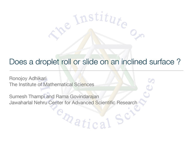 liquid-vapour interface area liquid-solid interface area surface tension E = lv Alv ( sv sl)Asl “Hamiltonian’’ equilibrium : minimize surface area at constant volume E = 0 with V constant gives drop shape and contact angle ✓ “constrained variational problem’’