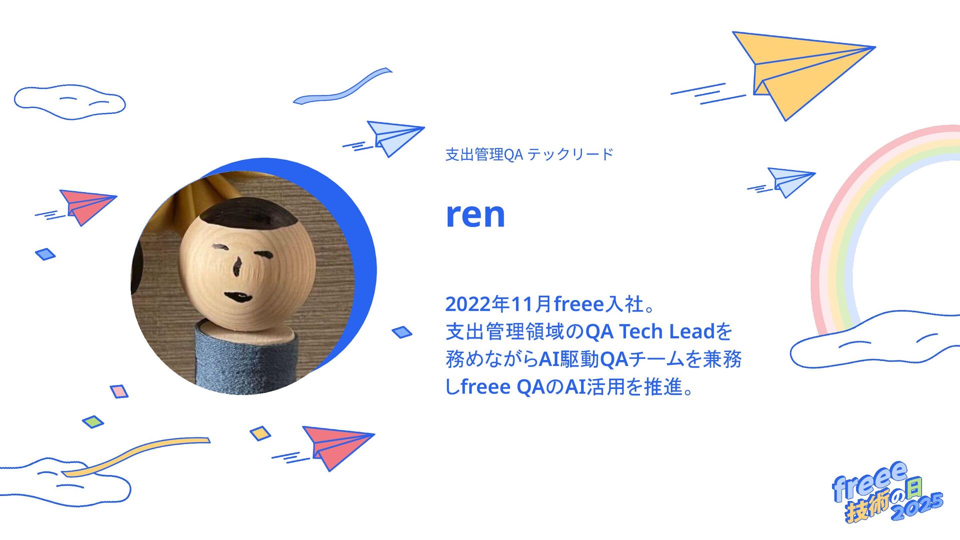 ren 2022年11月freee入社。 支出管理領域のQA Tech Leadを 務めながらAI駆動QAチームを兼務 しfreee QAのAI活用を推進。 ⽀出管理QA テックリード