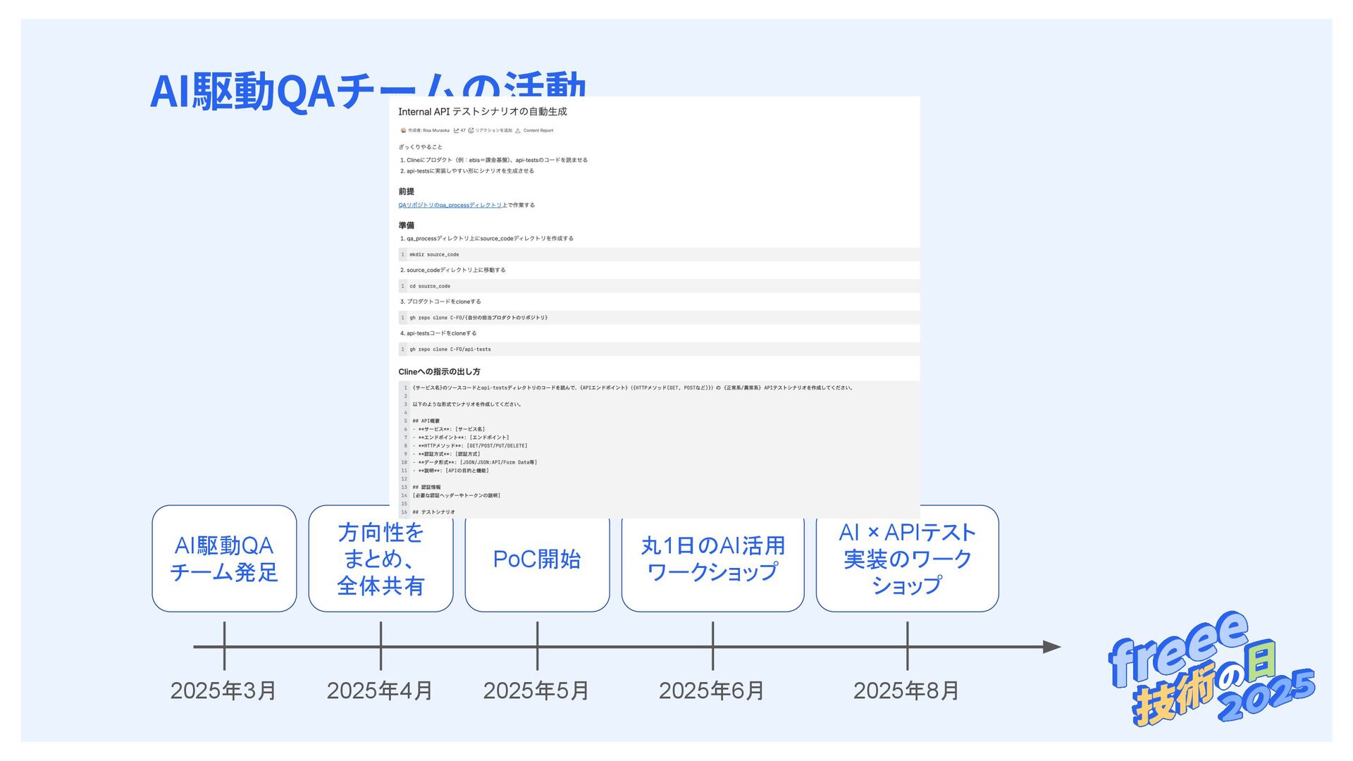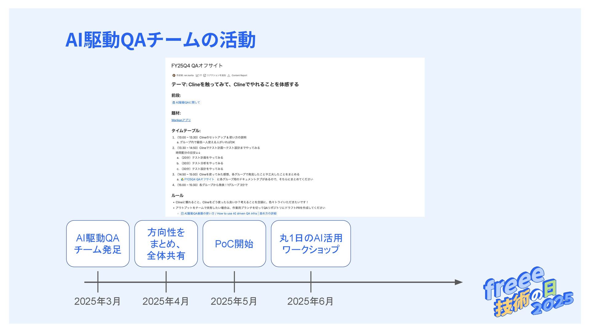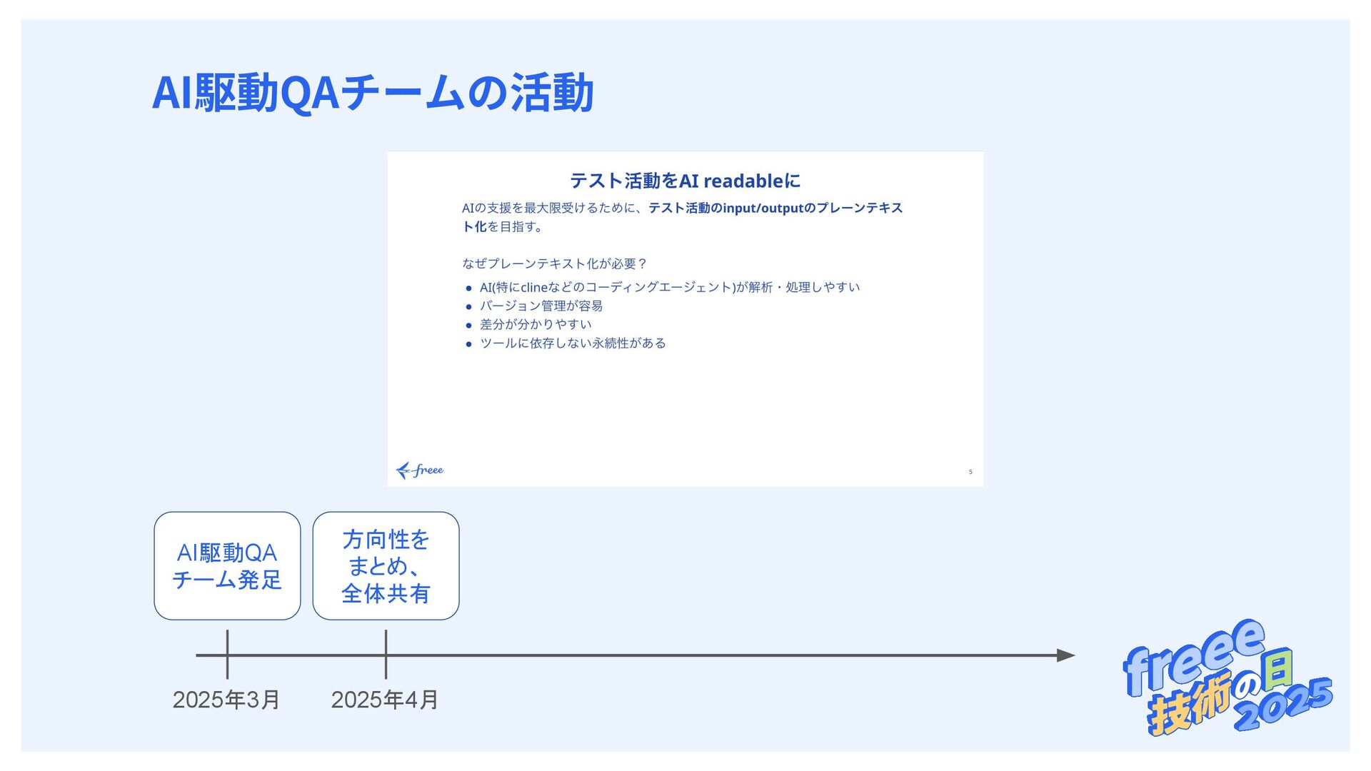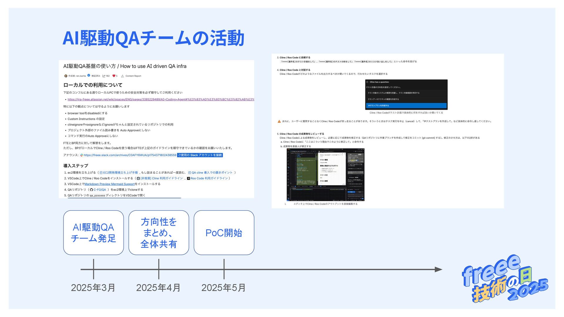 AI駆動QAチームの活動 2025年3月 AI駆動QA チーム発足 2025年4月 方向性を まとめ、 全体共有 2025年5月