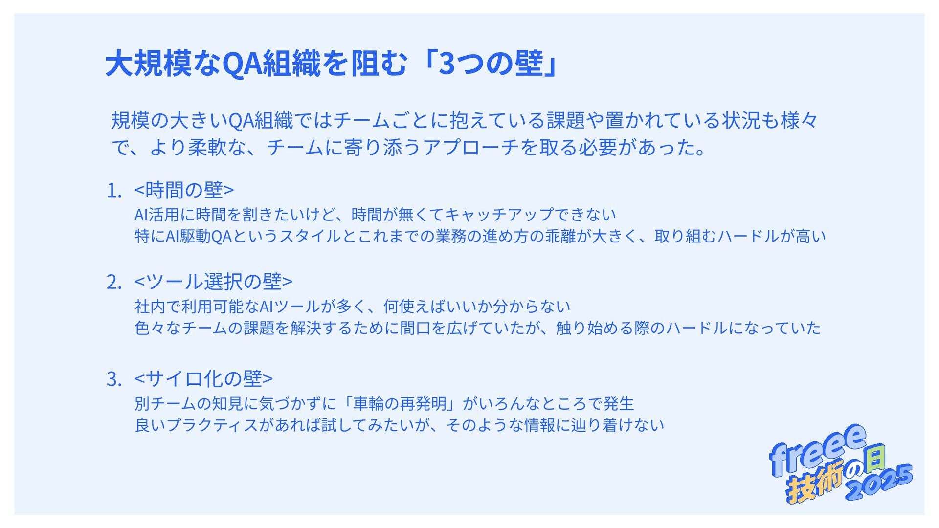 ⼤規模なQA組織を阻む「3つの壁」 規模の⼤きいQA組織ではチームごとに抱えている課題や置かれている状況も様々 で、より柔軟な、チームに寄り添うアプローチを取る必要があった。 1. <時間の壁> AI活⽤に時間を割きたいけど、時間が無くてキャッチアップできない 特にAI駆動QAというスタイルとこれまでの業務の進め⽅の乖離が⼤きく、取り組むハードルが⾼い 2. <ツール選択の壁>
