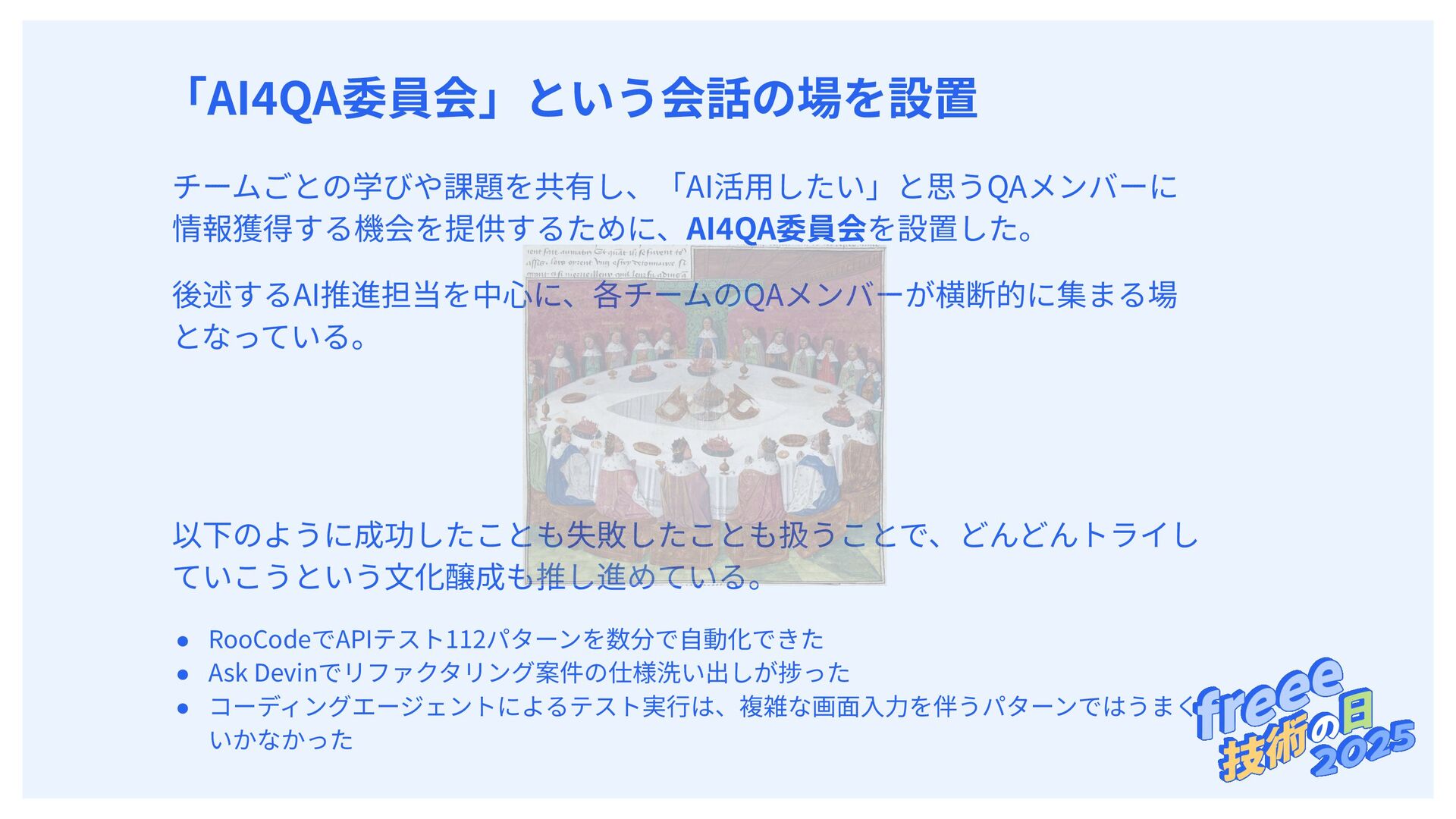 チームごとの学びや課題を共有し、「AI活⽤したい」と思うQAメンバーに 情報獲得する機会を提供するために、AI4QA委員会を設置した。 後述するAI推進担当を中⼼に、各チームのQAメンバーが横断的に集まる場 となっている。 以下のように成功したことも失敗したことも扱うことで、どんどんトライし ていこうという⽂化醸成も推し進めている。 • RooCodeでAPIテスト112パターンを数分で⾃動化できた •