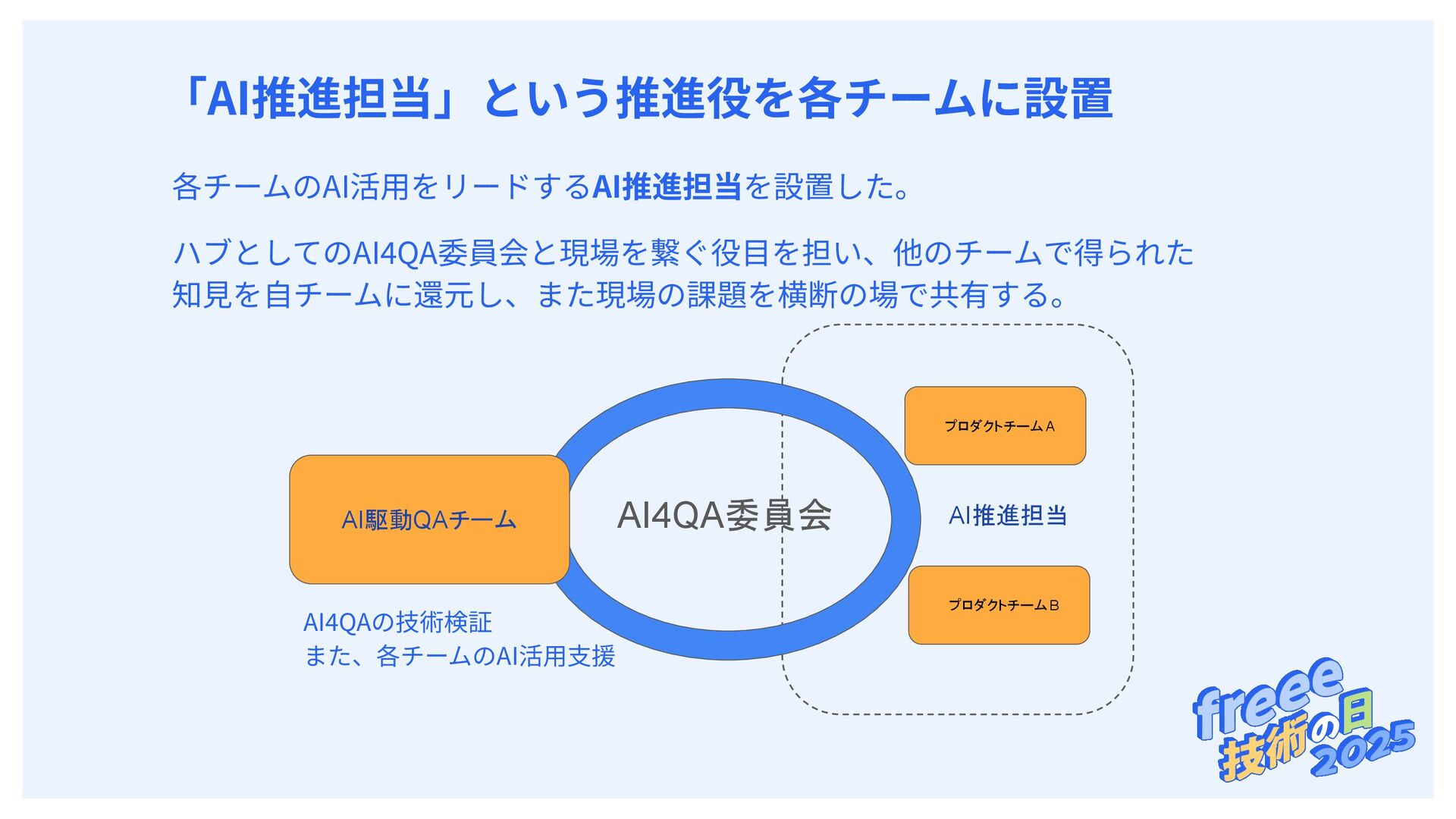 「AI推進担当」という推進役を各チームに設置 各チームのAI活⽤をリードするAI推進担当を設置した。 ハブとしてのAI4QA委員会と現場を繋ぐ役⽬を担い、他のチームで得られた 知⾒を⾃チームに還元し、また現場の課題を横断の場で共有する。 AI4QAの技術検証 また、各チームのAI活⽤⽀援 AI駆動QAチーム プロダクトチームA プロダクトチームB
