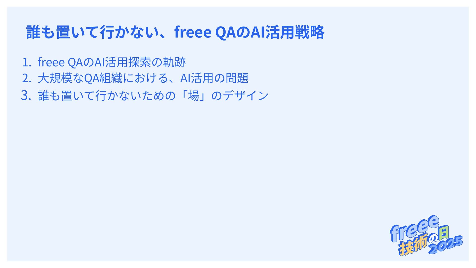 1. freee QAのAI活⽤探索の軌跡 2. ⼤規模なQA組織における、AI活⽤の問題 3. 誰も置いて⾏かないための「場」のデザイン 誰も置いて⾏かない、freee QAのAI活⽤戦略