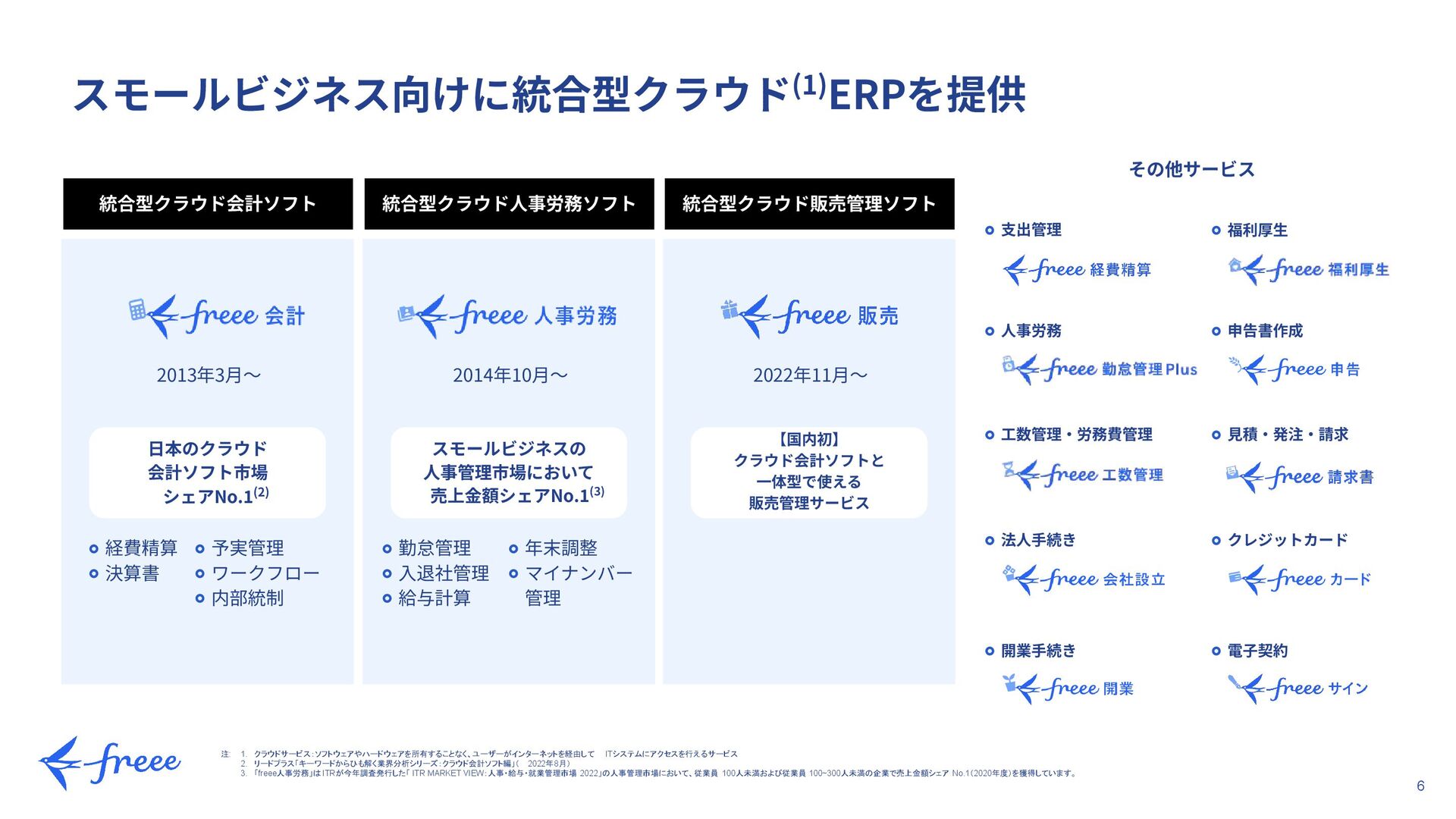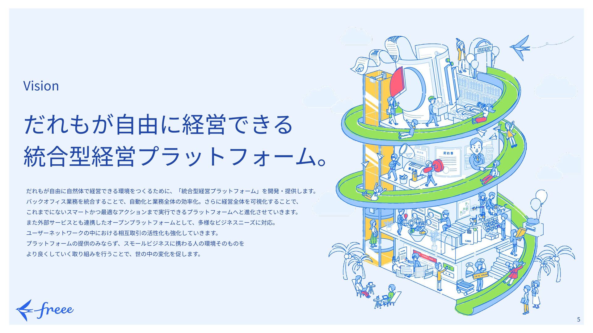 freeeは「スモールビジネスを、世界の主役に。」をミッションに掲げ、 統合型経営プラットフォームを開発‧提供し、 だれもが⾃由に⾃然体で経営できる環境をつくっていきます。 起業やビジネスを育てていくことを、もっと魅⼒的で気軽な⾏為に。 個⼈事業や中⼩企業などのスモールビジネスに携わるすべての⼈が、 じぶんらしく⾃信をもって経営できるように。 ⼤胆にスピード感をもってアイデアを具現化できるスモールビジネスは、 今までにない多様な価値観や⽣き⽅、 新しいイノベーションを⽣み出す起爆剤だと私たちは考えています。 スモールビジネスが⼤企業を刺激し、社会をさらにオモシロク、