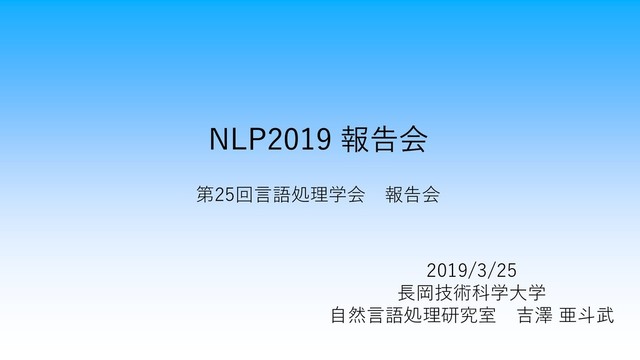 NLP2019 報告会 第25回言語処理学会 報告会 2019/3/25 長岡技術科学大学 自然言語処理研究室 吉澤 亜斗武