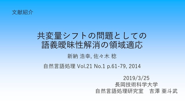 共変量シフトの問題としての 語義曖昧性解消の領域適応 新納 浩幸, 佐々木 稔 文献紹介 2019/3/25 長岡技術科学大学 自然言語処理研究室