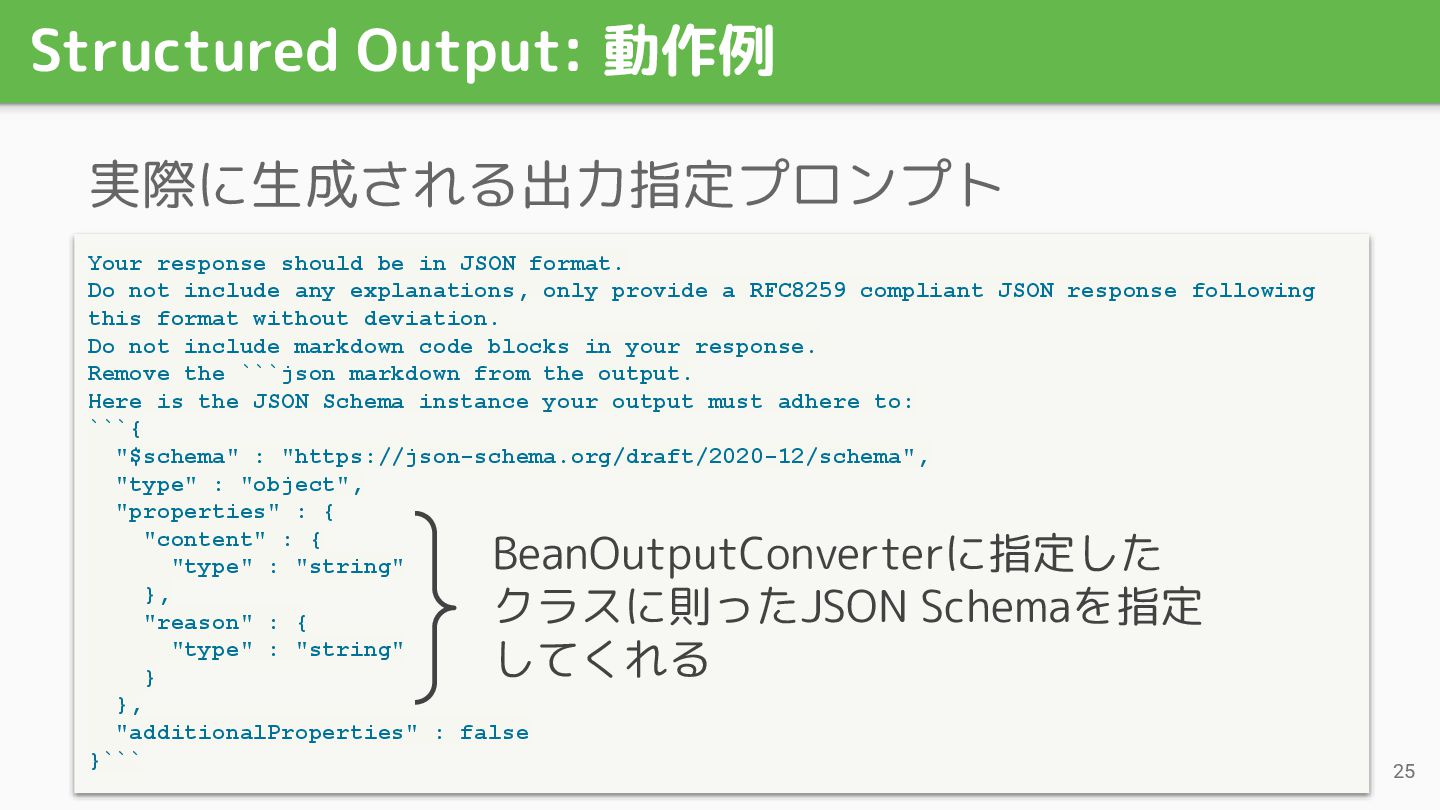 JSON format. Do not include any explanations, only provide a RFC8259 compliant JSON response following this format without deviation. Do not include markdown code blocks in your response. Remove the ```json markdown from the output. Here is the JSON Schema instance your output must adhere to: ```{ "$schema" : "https://json-schema.org/draft/2020-12/schema", "type" : "object", "properties" : { "content" : { "type" : "string" }, "reason" : { "type" : "string" } }, "additionalProperties" : false }``` BeanOutputConverterに指定した クラスに則ったJSON Schemaを指定 してくれる