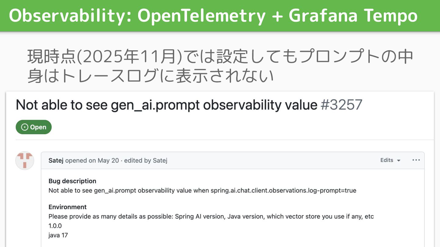 SourceCode ◦ https://github.com/spring-projects/spring-ai • Spring AI Examples ◦ https://github.com/spring-projects/spring-ai-examples • Spring I/O Keynote ◦ https://www.youtube.com/watch?v=oUK1Np4OvnM • IK.AM: Java on Azure Day 2025で"Spring AIで学ぶMCPの活用"について話してきました。 ◦ https://ik.am/entries/858 • Grafana Labs: Auto-instrumenting a Java Spring Boot application for traces and logs using OpenTelemetry and Grafana Tempo ◦ https://grafana.com/blog/2021/02/03/auto-instrumenting-a-java-spring-boot-application-for-traces-and-logs-using-op entelemetry-and-grafana-tempo/ • Google Gemini SourceCode ◦ https://github.com/google-gemini/gemini-cli 57