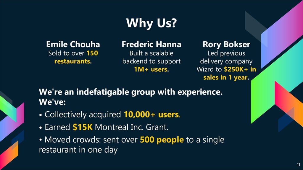 support 1M+ users. Rory Bokser Led previous delivery company Wizrd to $250K+ in sales in 1 year. Emile Chouha Sold to over 150 restaurants. We're an indefatigable group with experience. We've: • Collectively acquired 10,000+ users. • Earned $15K Montreal Inc. Grant. • Moved crowds: sent over 500 people to a single restaurant in one day