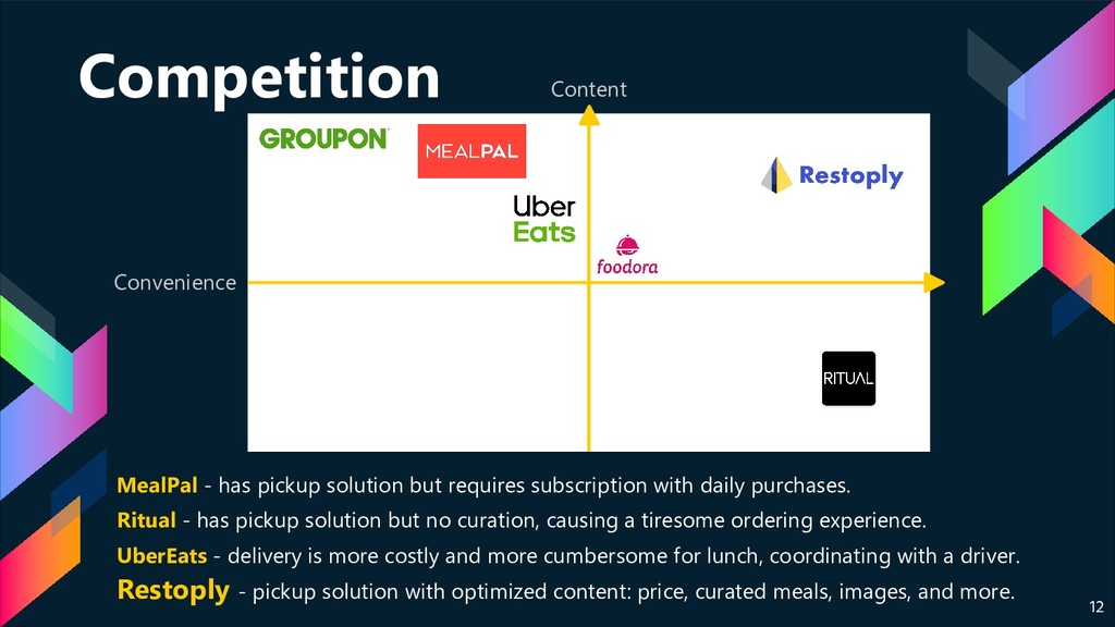 requires subscription with daily purchases. Ritual - has pickup solution but no curation, causing a tiresome ordering experience. UberEats - delivery is more costly and more cumbersome for lunch, coordinating with a driver. Restoply - pickup solution with optimized content: price, curated meals, images, and more.