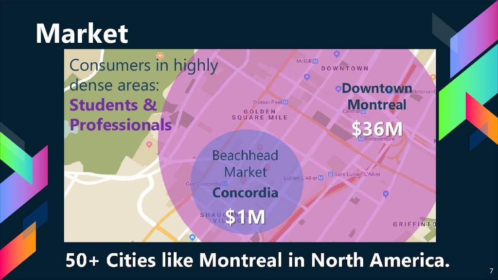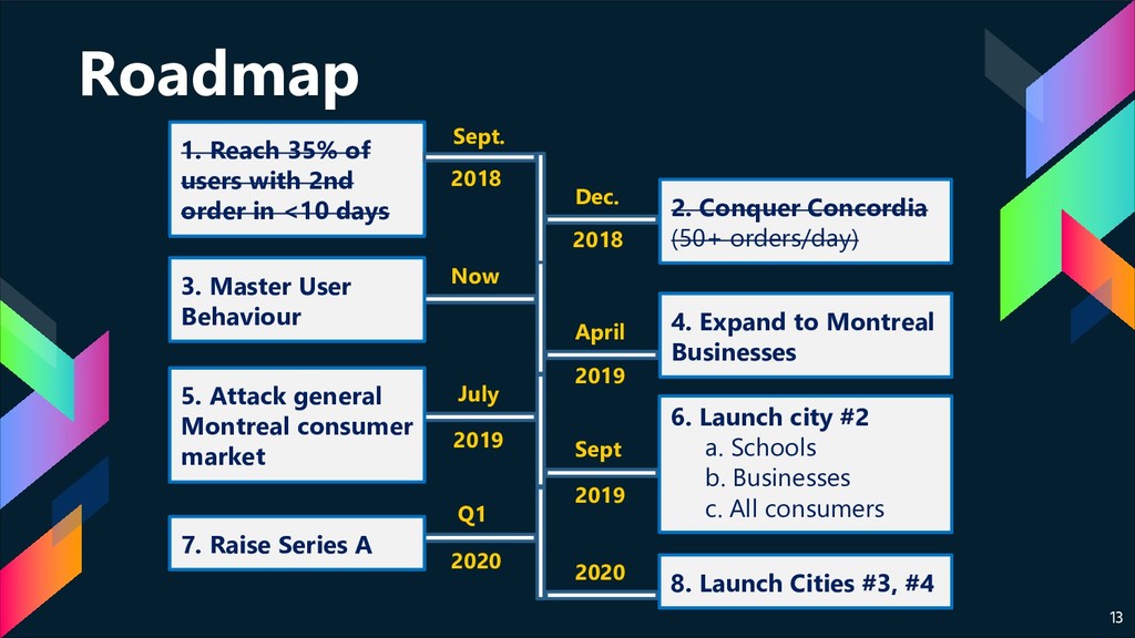 Businesses 5. Attack general Montreal consumer market 6. Launch city #2 a. Schools b. Businesses c. All consumers 7. Raise Series A 8. Launch Cities #3, #4 April Now 2019 2019 July Sept 2019 Q1 2020 2020 Dec. 2018 1. Reach 35% of users with 2nd order in <10 days 2018 Sept. 2. Conquer Concordia (50+ orders/day)