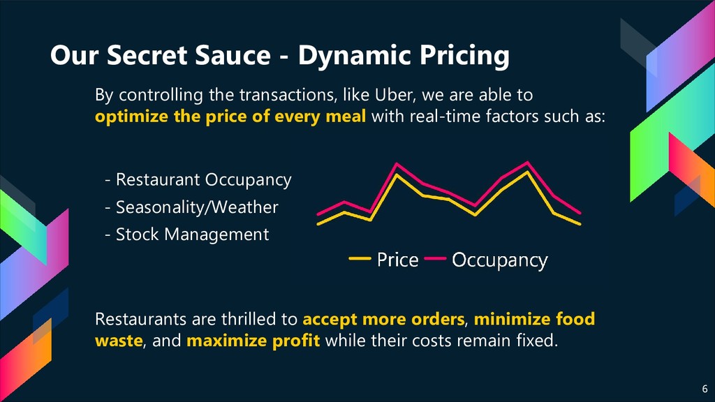 like Uber, we are able to optimize the price of every meal with real-time factors such as: 6 - Restaurant Occupancy - Seasonality/Weather - Stock Management Restaurants are thrilled to accept more orders, minimize food waste, and maximize profit while their costs remain fixed.