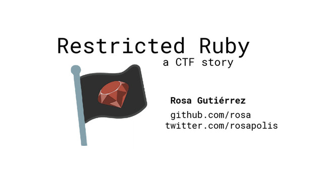 It's not common to find Ruby problems in security CTF (Capture The Flag) competitions, but luckily there are some out there. These type of problems are always a great opportunity to learn some Ruby internals or features of the language that aren't usually known. They are also a perfect excuse to do crazy things and get as creative as possible. In this talk I'll present some problems from the CTF organised by a famous Japanese security group in 2016 and some ways to solve them.