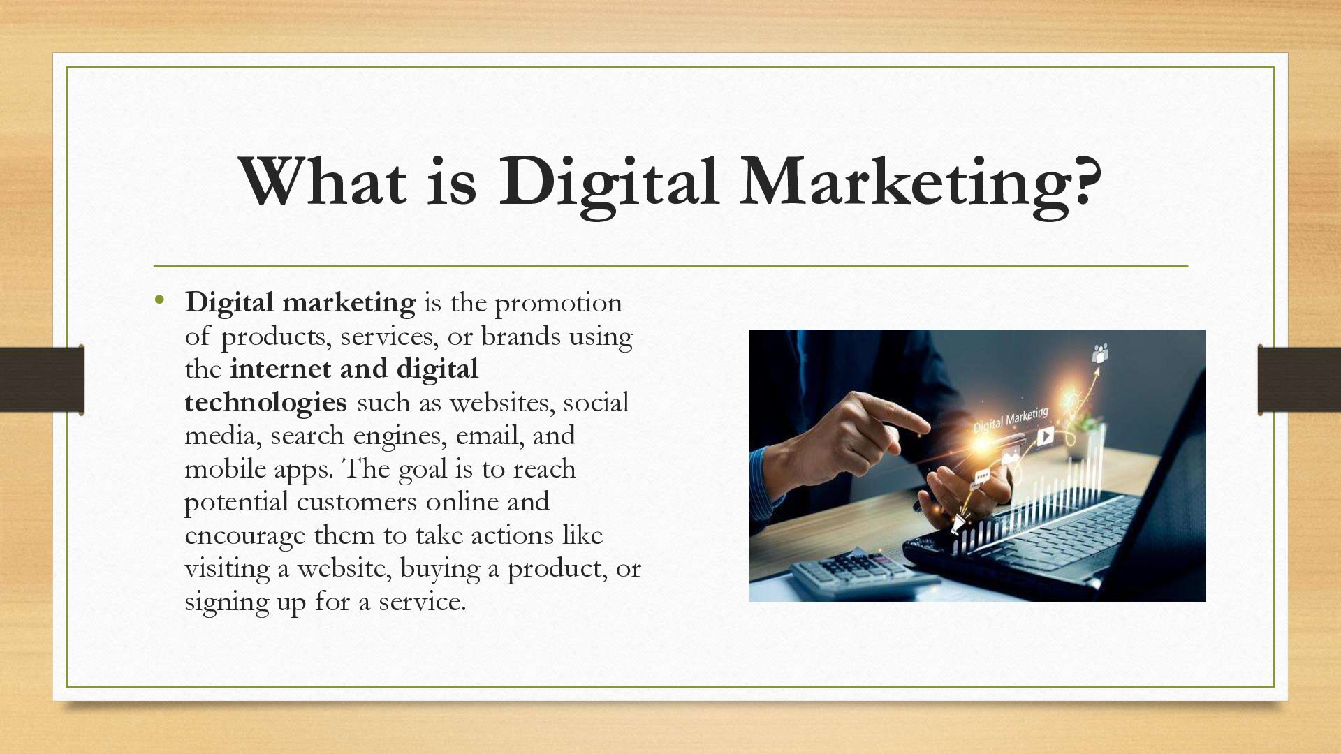 Digital marketing refers to the use of online platforms, digital technologies, and internet-based channels to promote products, services, or brands to a targeted audience. It includes strategies such as social media marketing, search engine optimization (SEO), email marketing, content marketing, and online advertising. By leveraging data and analytics, businesses can reach the right people at the right time, measure performance in real-time, and continuously improve their campaigns. Digital marketing is essential in today’s connected world, helping businesses build brand awareness, engage customers, and drive growth efficiently.