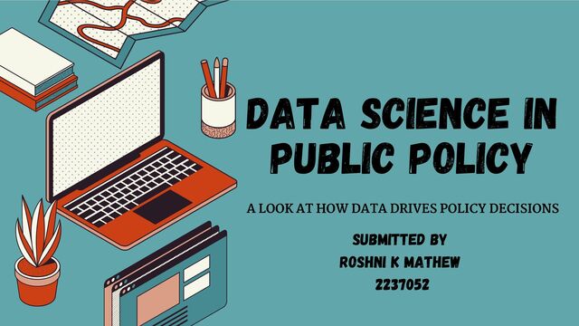 WITHIN IT A public policy is simply what the government does or does not do about a problem that comes before them for consideration & possible action WHAT IS PUBLIC POLICY An interdisciplinary field that focuses on extracting knowledge from data sets. This includes analysis, interpreting findings etc. WHAT IS DATA SCIENCE HOW IS DATA SCIENCE APPLIED IN THE FIELD OF PUBLIC POLICY Data science has improved the way in which public policies are designed & implemented. Policymakers can acquire and analyze data in real-time, and develop more evidence based solutions. Data science also lends policymakers fresh insights into an issue
