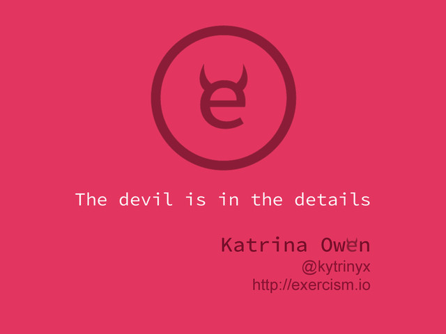 Katrina accidentally became a developer while pursuing a degree in molecular biology. When programming, her focus is on automation, workflow optimization, and refactoring. She works primarily in Go and Ruby, contributes to several open source projects, and is the creator of exercism.io.