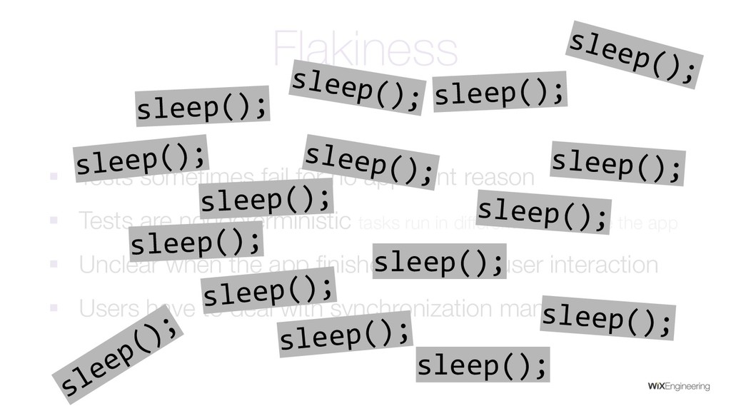 are nondeterministic tasks run in different order inside the app § Unclear when the app finished handling user interaction § Users have to deal with synchronization manually Flakiness sleep(); sleep(); sleep(); sleep(); sleep(); sleep(); sleep(); sleep(); sleep(); sleep(); sleep(); sleep(); sleep(); sleep(); sleep(); sleep();