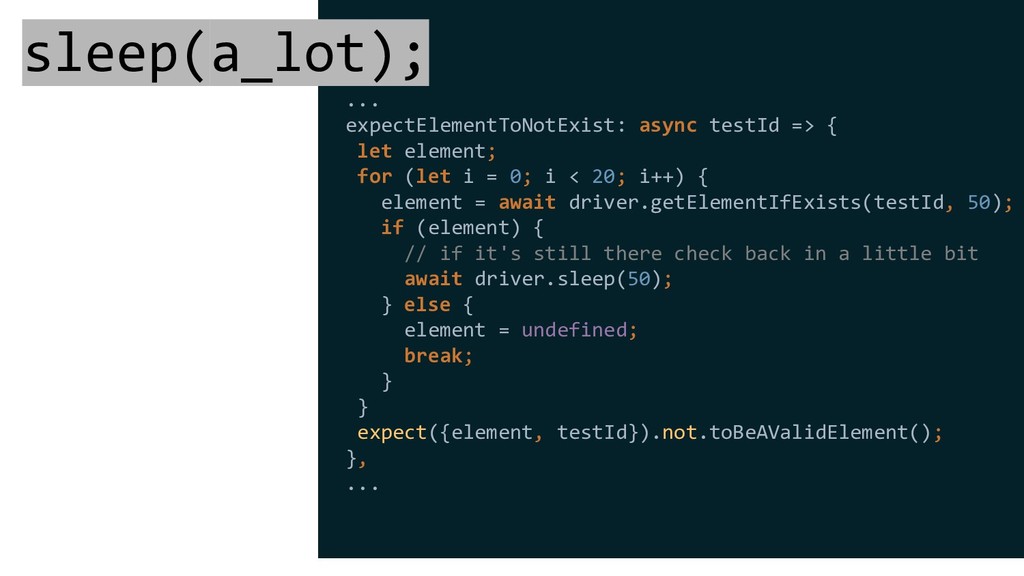 i = 0; i < 20; i++) { element = await driver.getElementIfExists(testId, 50); if (element) { // if it's still there check back in a little bit await driver.sleep(50); } else { element = undefined; break; } } expect({element, testId}).not.toBeAValidElement(); }, ... sleep(a_lot);