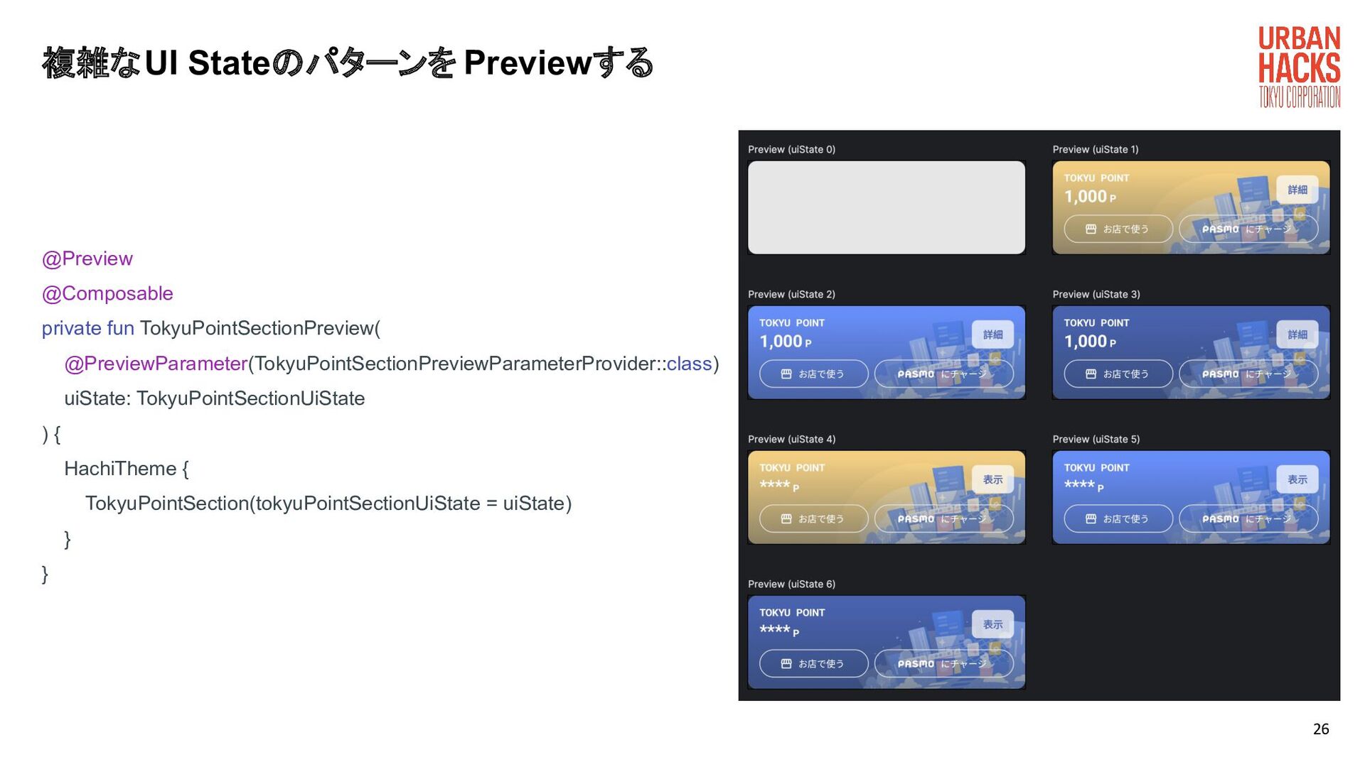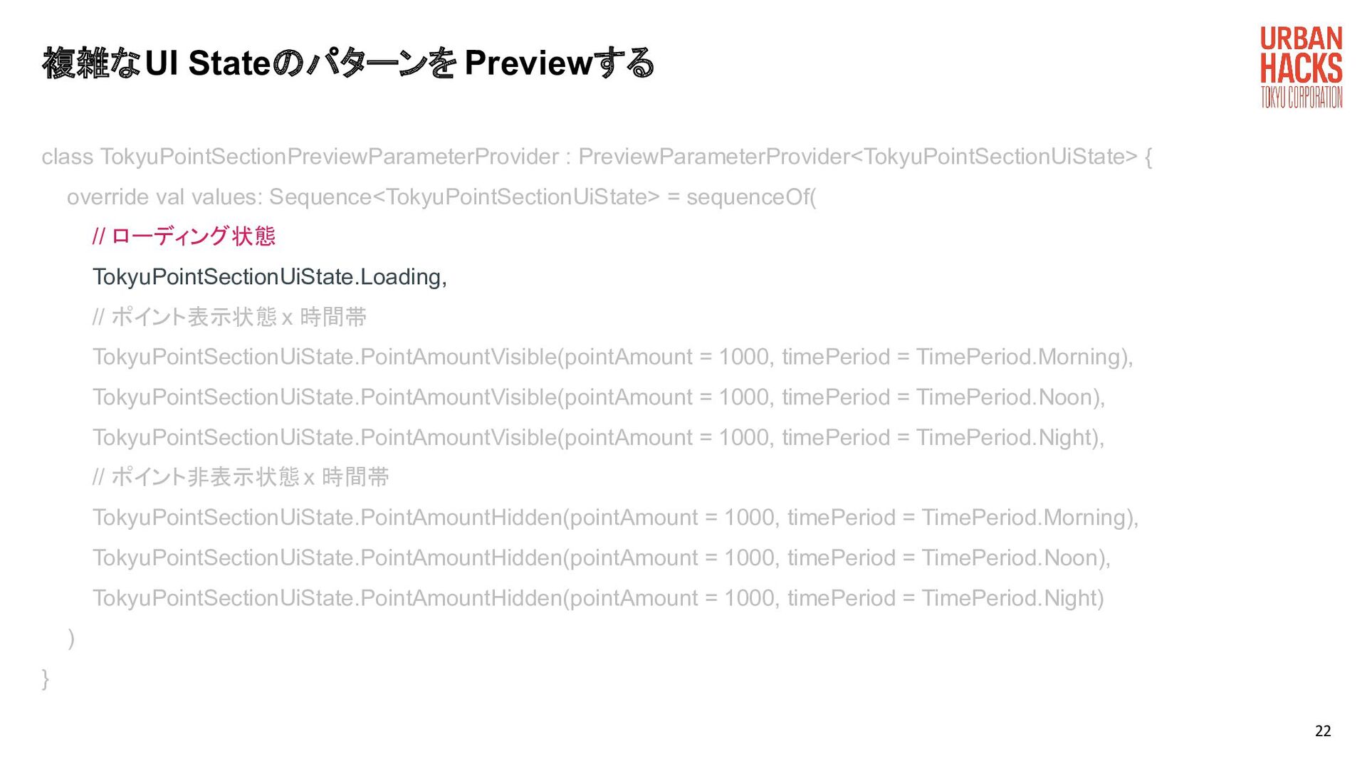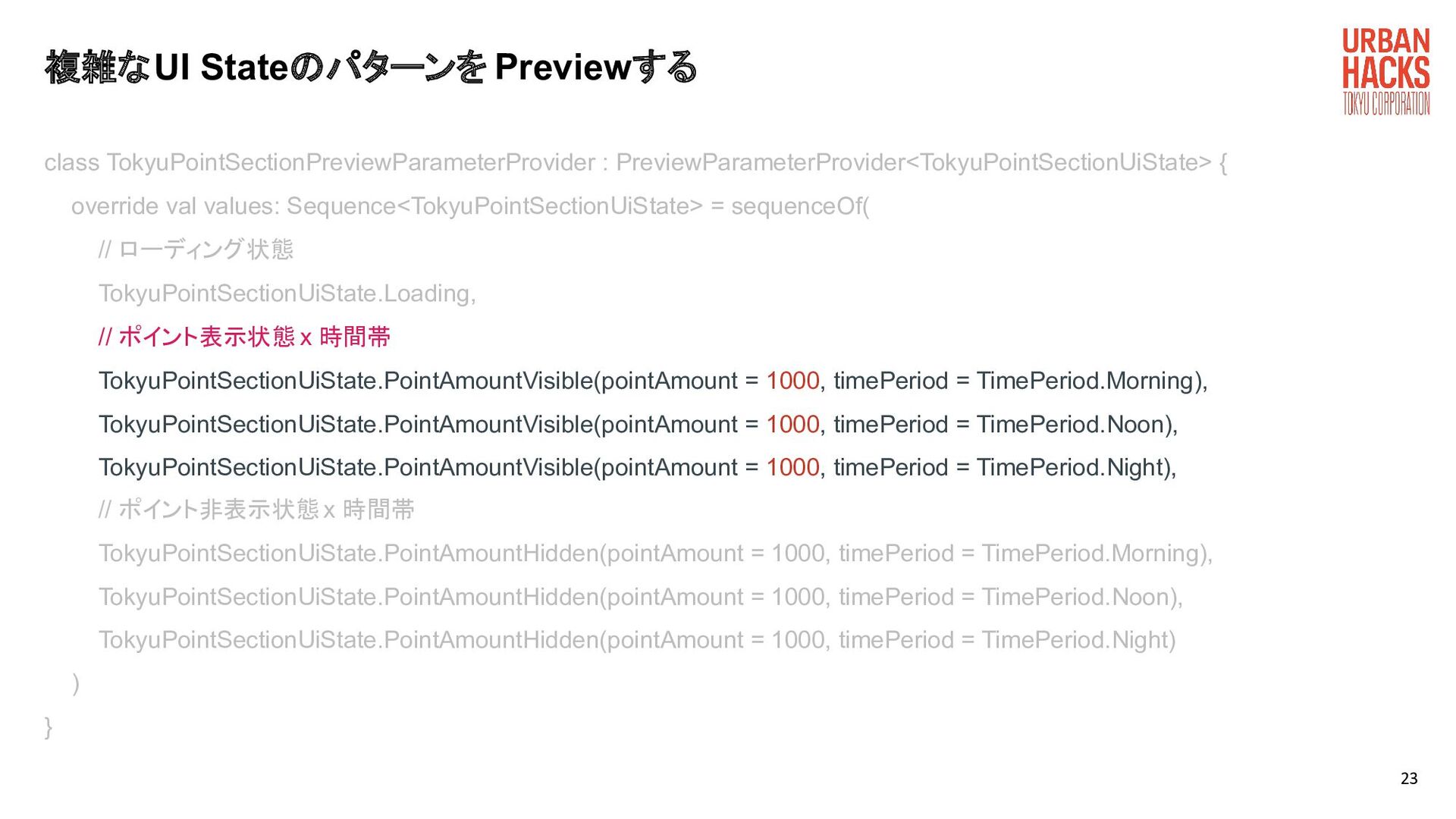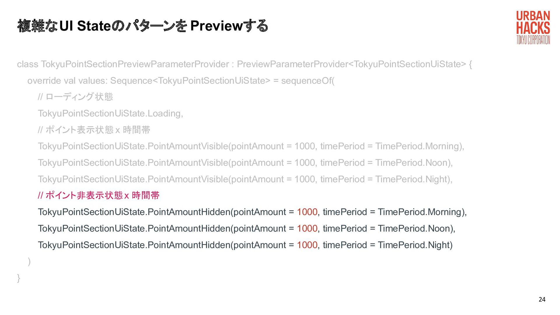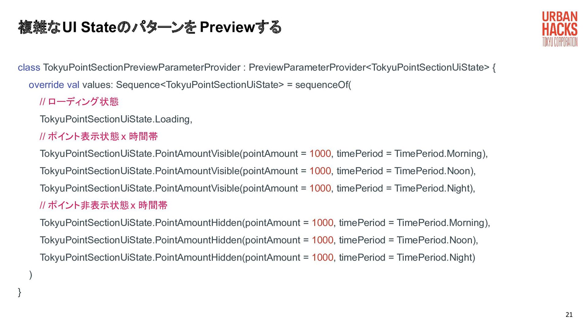 val values: Sequence<TokyuPointSectionUiState> = sequenceOf( // ローディング状態 TokyuPointSectionUiState.Loading, // ポイント表示状態 x 時間帯 TokyuPointSectionUiState.PointAmountVisible(pointAmount = 1000, timePeriod = TimePeriod.Morning), TokyuPointSectionUiState.PointAmountVisible(pointAmount = 1000, timePeriod = TimePeriod.Noon), TokyuPointSectionUiState.PointAmountVisible(pointAmount = 1000, timePeriod = TimePeriod.Night), // ポイント非表示状態 x 時間帯 TokyuPointSectionUiState.PointAmountHidden(pointAmount = 1000, timePeriod = TimePeriod.Morning), TokyuPointSectionUiState.PointAmountHidden(pointAmount = 1000, timePeriod = TimePeriod.Noon), TokyuPointSectionUiState.PointAmountHidden(pointAmount = 1000, timePeriod = TimePeriod.Night) ) }