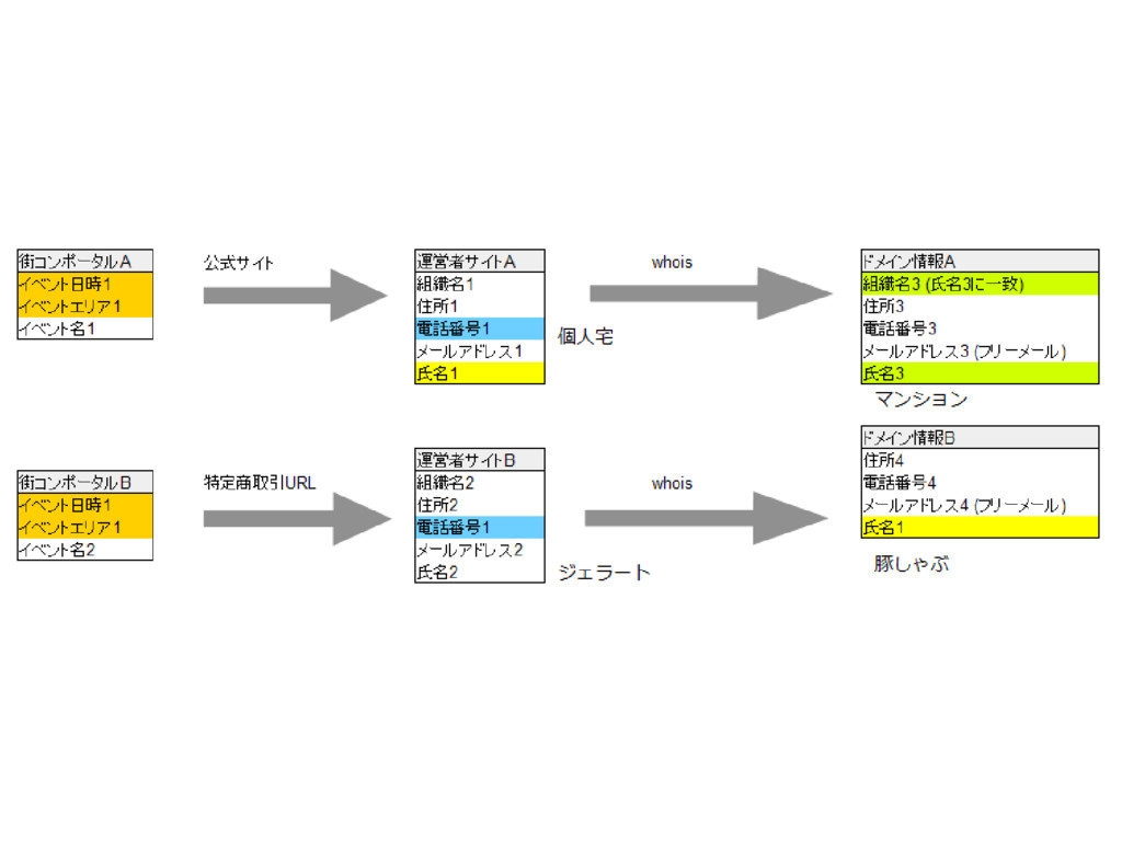 増える不審点 • URLが載っていた街コンポータルサイトの記載に ある運営責任者ではなく、 URLが載っていなかったイベント運営者のサイトに 記載されている責任者名が出てくる • メールアドレスが今度はフリーメール • そして新たなる住所と電話番号