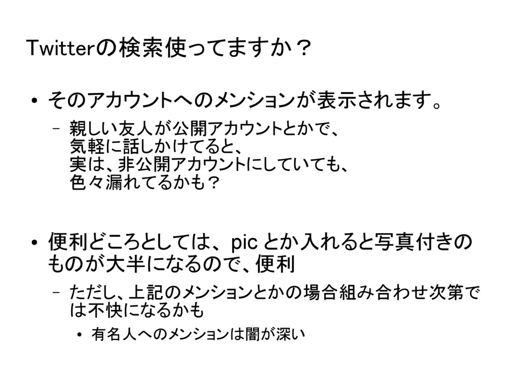 Twitterの検索使ってますか? • そのアカウントへのメンションが表示されます。 – 親しい友人が公開アカウントとかで、 気軽に話しかけてると、 実は、非公開アカウントにしていても、 色々漏れてるかも? • 便利どころとしては、