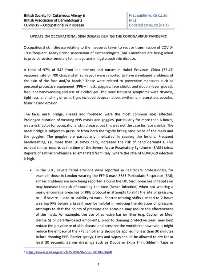 COVID-19 – Occupational skin disease First published 08.04.20 (v 1) Updated 20.04.20 (v 1.1) 1 UPDATE ON OCCUPATIONAL SKIN DISEASE DURING THE CORONAVIRUS PANDEMIC Occupational skin disease relating to the measures taken to reduce transmission of COVID- 19 is frequent. Many British Association of Dermatologists (BAD) members are being asked to provide advice remotely to manage and mitigate such skin disease. A total of 97% of 542 front-line doctors and nurses in Hubei Province, China (77.4% response rate of 700 clinical staff surveyed) were reported to have developed problems of the skin of the face and/or hands.1 These were related to preventive measures such as personal protective equipment (PPE – mask, goggles, face shield, and double-layer gloves), frequent handwashing and use of alcohol gel. The most frequent symptoms were dryness, tightness, and itching or pain. Signs included desquamation, erythema, maceration, papules, fissuring and erosion. The face, nasal bridge, cheeks and forehead were the most common sites affected. Prolonged duration of wearing N95 masks and goggles, particularly for more than 6 hours, was a risk factor for occupational skin disease, but this was not the case for face shields. The nasal bridge is subject to pressure from both the tightly fitting nose piece of the mask and the goggles. The goggles are particularly implicated in causing the lesions. Frequent handwashing, i.e. more than 10 times daily, increased the risk of hand dermatitis. This echoed similar reports at the time of the Severe Acute Respiratory Syndrome (SARS) crisis. Reports of similar problems also emanated from Italy, where the rate of COVID-19 infection is high. • In the U.K., severe facial erosions were reported in healthcare professionals, for example those in London wearing the FFP-3 mask 8833 Particulate Respirator (3M); similar problems are now being reported around the UK. Such breaches in facial skin may increase the risk of touching the face (hence infection) when not wearing a mask, encourage breaches of PPE protocol in attempts to shift the site of pressure, or – if severe – lead to inability to work. Shorter rotating shifts (limited to 2 hours wearing PPE before a break) may be helpful in reducing the duration of pressure. Attempts to shift the points of pressure and abrasion may reduce the effectiveness of the mask. For example, the use of adhesive barrier films (e.g. Cavilon or Medi Derma S) or paraffin-based emollients, prior to donning protective gear, may help reduce the prevalence of skin disease and preserve the workforce; however, it might reduce the efficacy of the PPE. Emollients should be applied no less than 30 minutes before donning PPE. Barrier sprays, films and wipes should be allowed to dry for at least 30 seconds. Barrier dressings such as Duoderm Extra Thin, Silderm Tape or 1 https://www.jaad.org/article/S0190-9622(20)30392-3/pdf