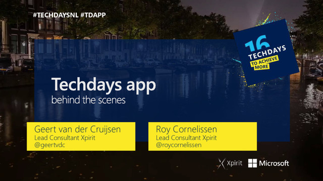 This session, co-presented with Geert van der Cruijsen, is about how we built the TechDays 16 mobile app and highlights some of the lessons learned from that project.