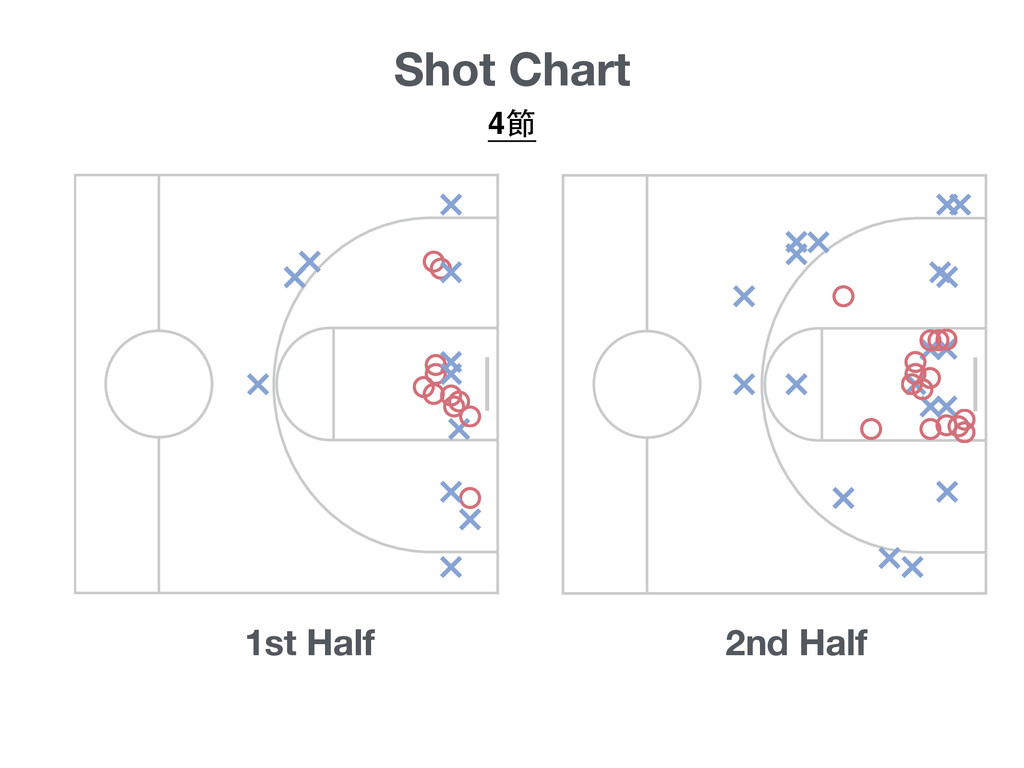 PTs of Steal: Offense time: 2 32 17 8 15.4s PTs/Possession: 0.71 PTs/Shot: 0.85 Rebound: 57.1% 4節 2節 32 52 6 32 15.3s 0.77 0.92 61.0 % 8 6