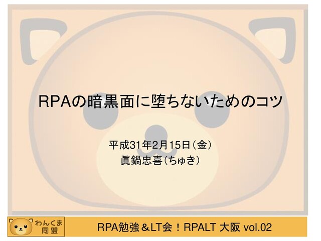 RPA勉強&LT会!RPALT 大阪 vol.02 RPAの暗黒面に堕ちないためのコツ 平成31年2月15日(金) 眞鍋忠喜(ちゅき)