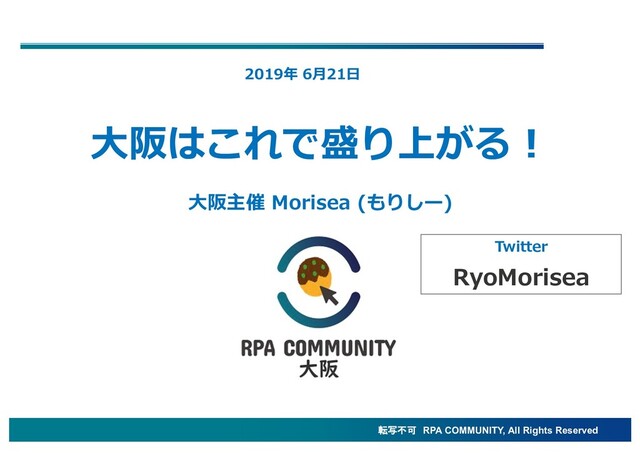 転写不可 RPA COMMUNITY, All Rights Reserved ⼤阪はこれで盛り上がる! 2019年 6⽉21⽇ ⼤阪主催