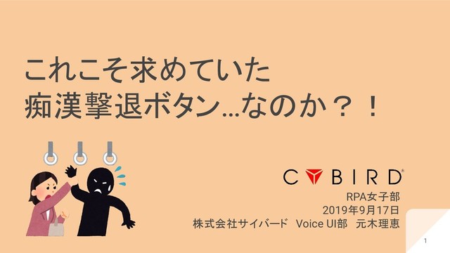 これこそ求めていた 痴漢撃退ボタン…なのか?! RPA女子部 2019年9月17日 株式会社サイバード Voice UI部 元木理恵 1