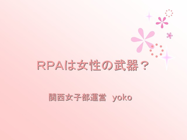 まとめ ⚫RPA化に向く業務の担当は女性が多い ⚫RPAの開発技術は、武器になる ⚫武器が増えれば、 意識向上、働きがいがUPします! ⚫ロボットを沢山、楽しくつくりましょう