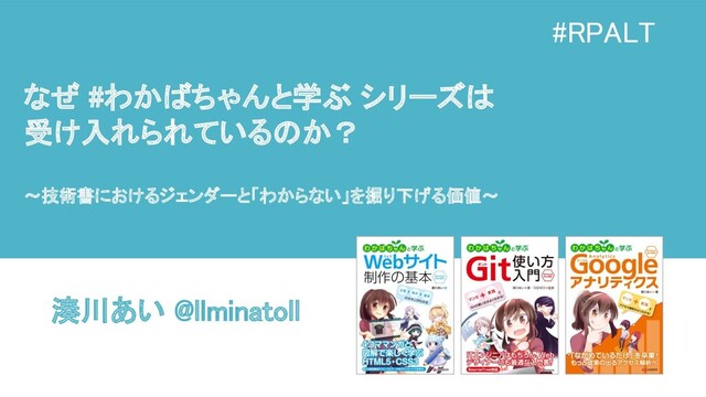 なぜ #わかばちゃんと学ぶ シリーズは 受け入れられているのか? 〜技術書におけるジェンダーと「わからない」を掘り下げる価値〜 湊川あい @llminatoll