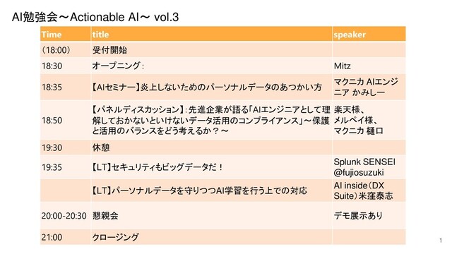 1 AI勉強会~Actionable AI~ vol.3 Time title speaker (18:00) 受付開始 18:30