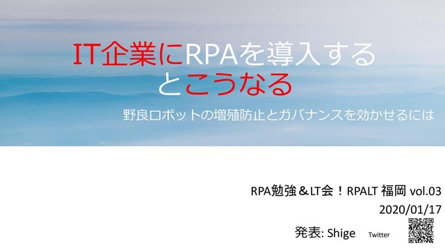 IT企業にRPAを導入する とこうなる 野良ロボットの増殖防止とガバナンスを効かせるには RPA勉強&LT会!RPALT 福岡 vol.03 2020/01/17 発表: Shige Twitter
