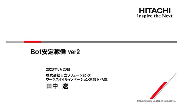 会社名: 株式会社日立ソリューションズ 本社所在地: 東京都品川区東品川4-12-7 電話番(代表): 03-5780-2111 設立年月日: 1970年9月21日 資本金: 200億円 従業員数(連結):12,373名 (2019年3月31日現在) 2017年 Automation Anywhere販売開始 2019年 Automation Anywhere Partner of the year受賞 2020年 Automation Anywhere New Logo Award受賞 Bot Creator:49台 Bot Runner:47台 利用(2020年4月現在) 会社概要 Automation Anywhere歴